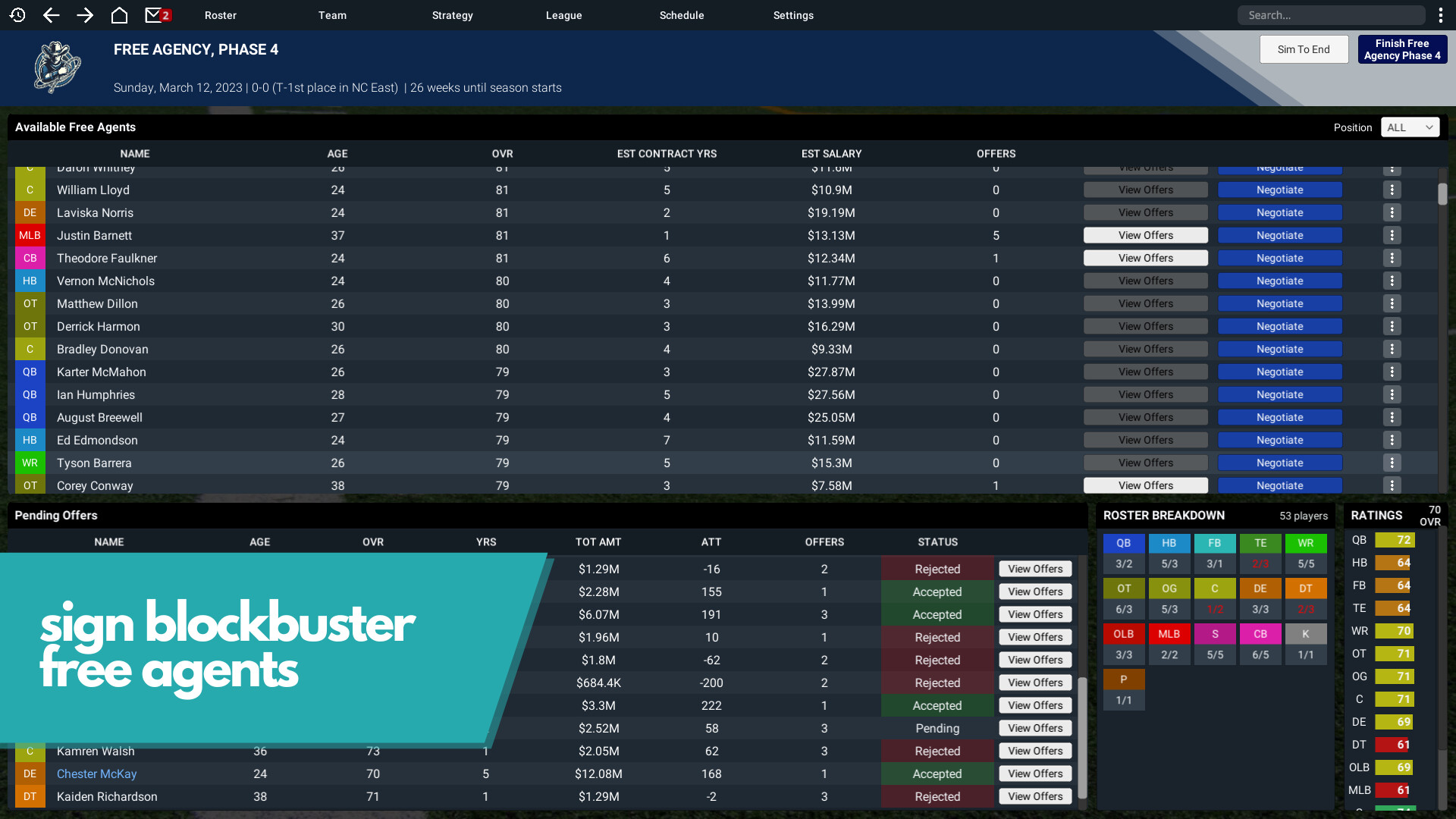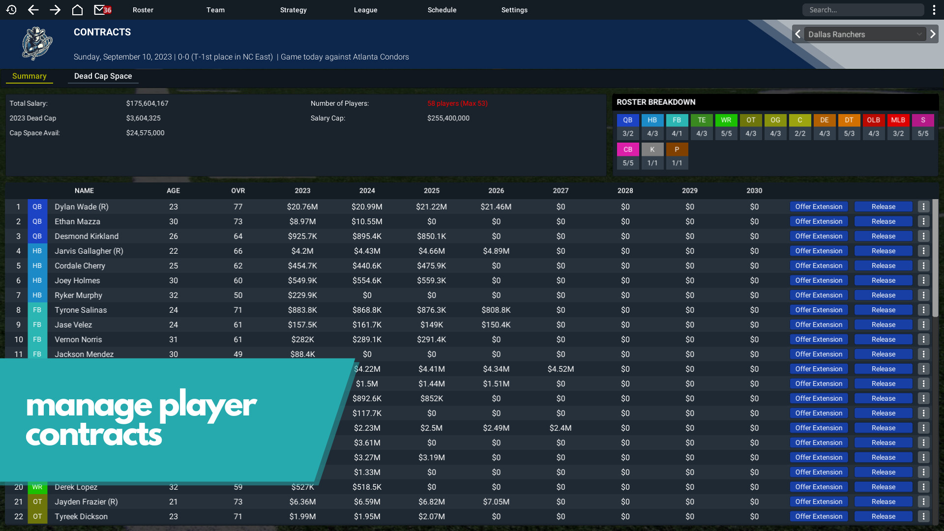 Negotiate contracts with players using an extensive real-world contract system