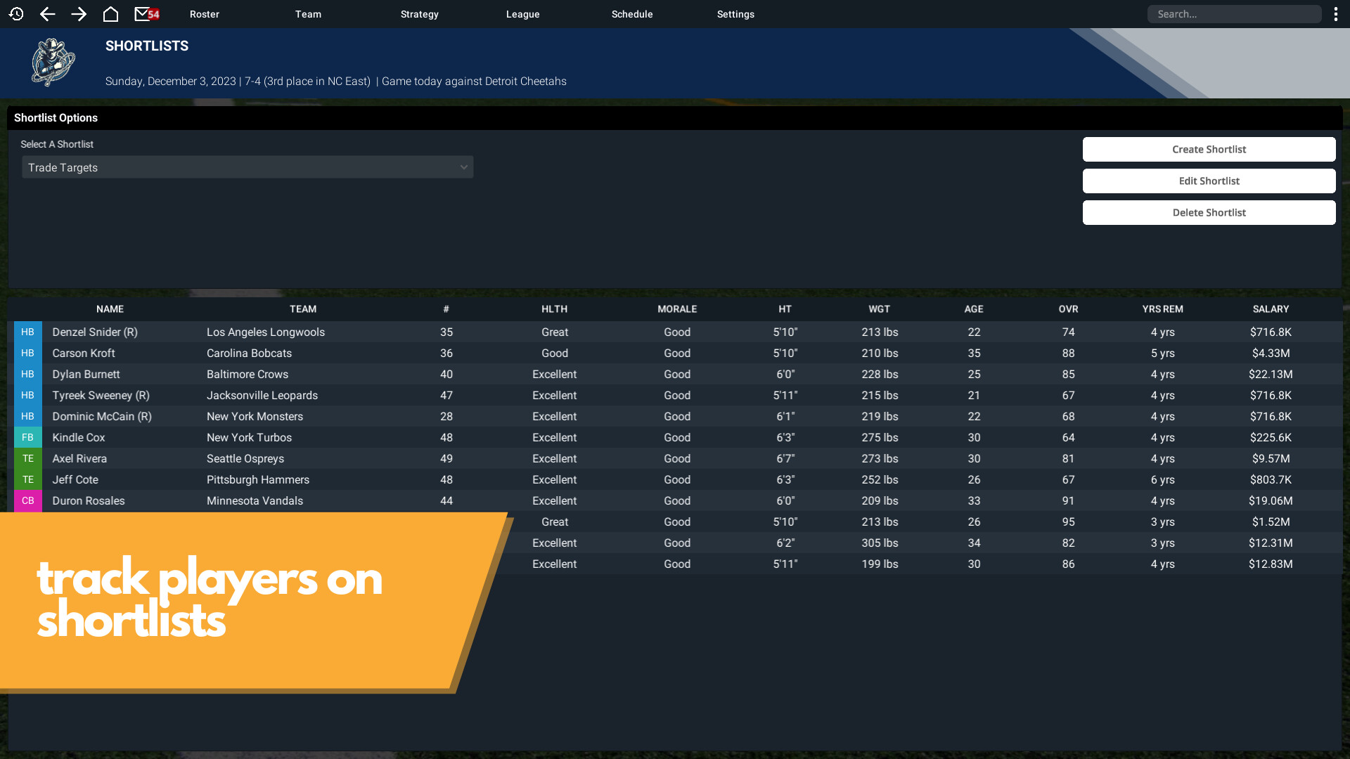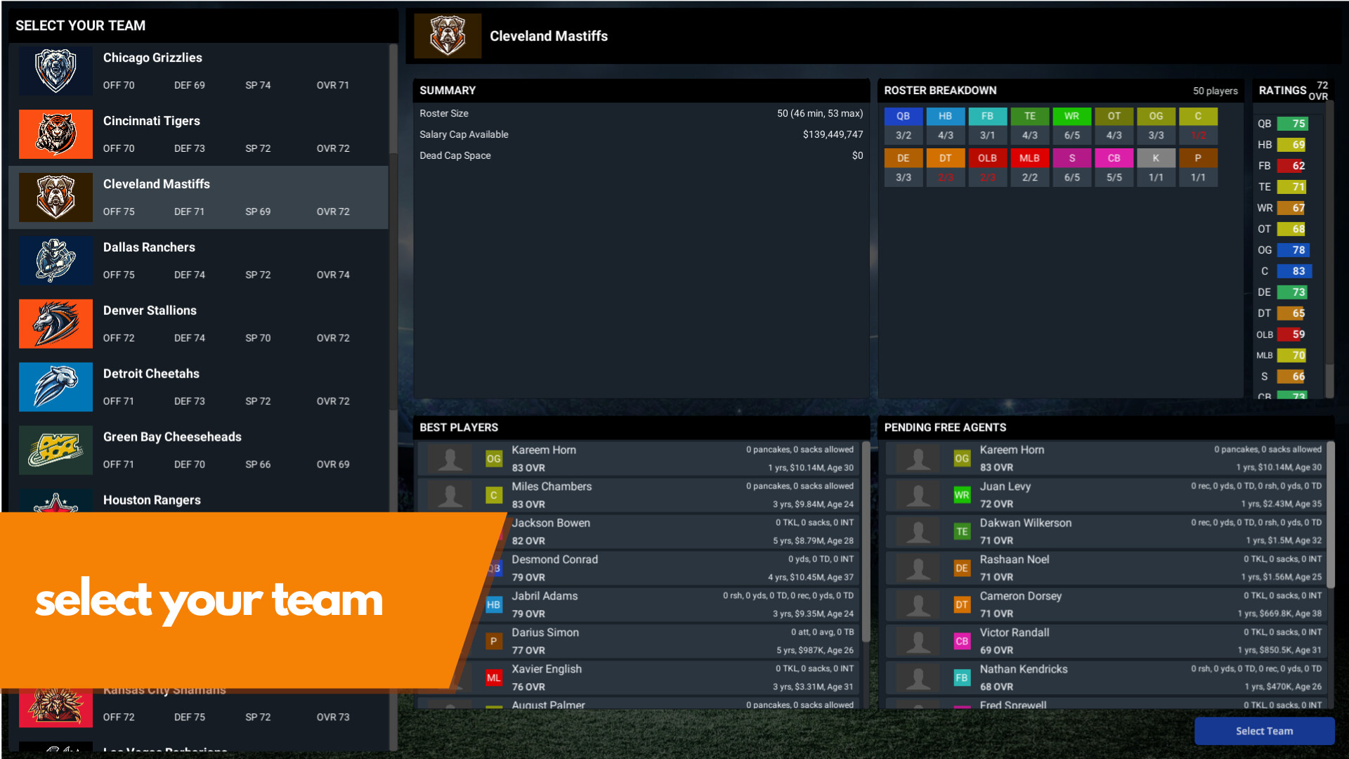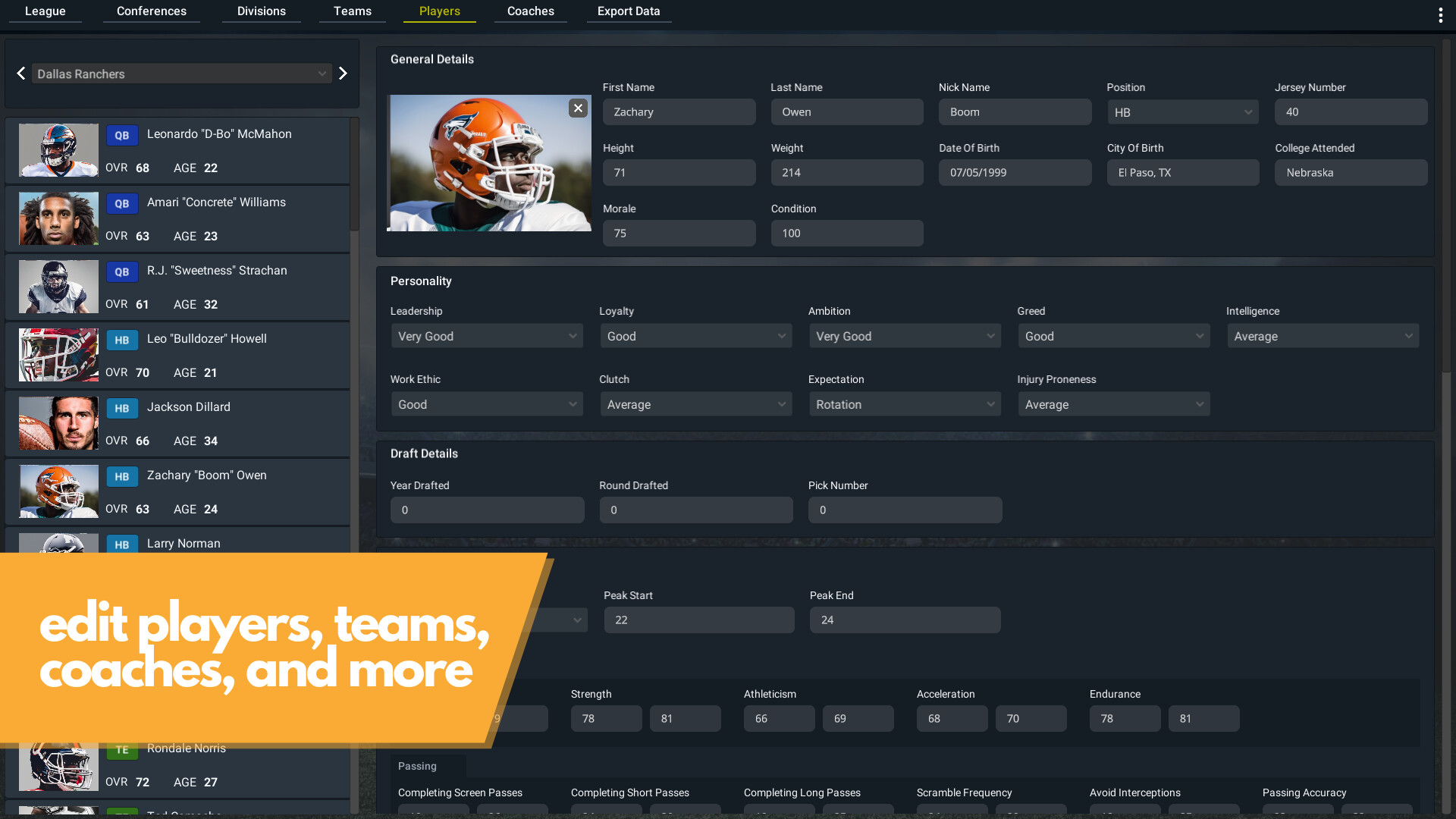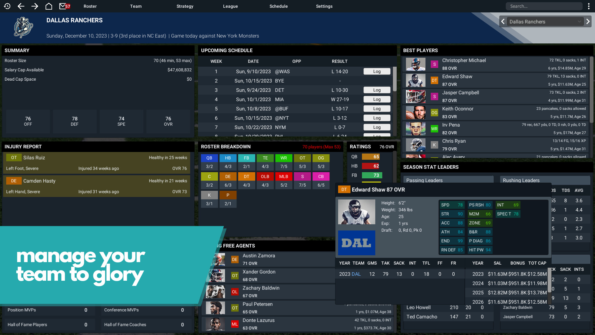 Take over a professional American football team, in this single-player football management simulator. As both general manager and head coach, build a football dynasty that will last for decades to come. Trade, draft, sign free agents, and coach your way into the hall of fame! Do you have what it takes to become a football legend?