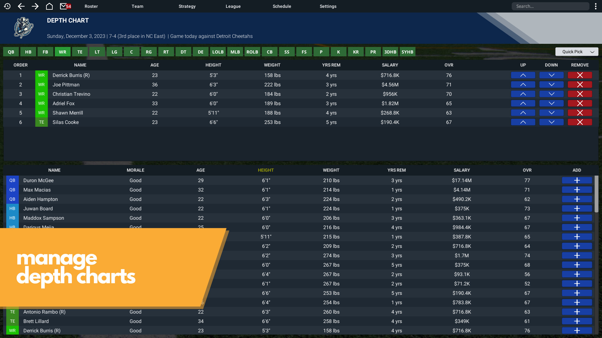 A depth chart editor. Set your starters, and decide who your backups and replacements will be.
