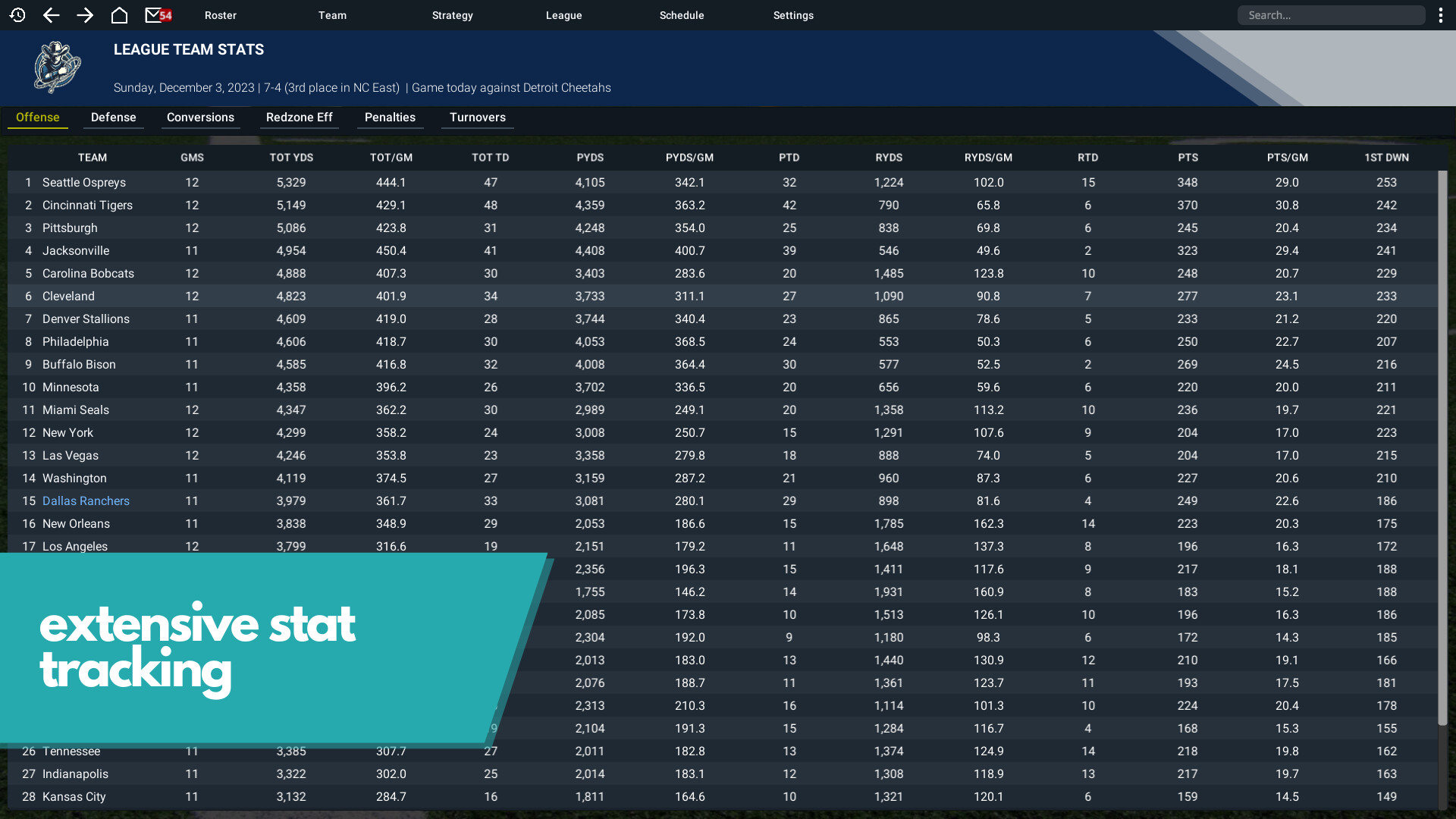 If stats are your thing, then you have found the right game! Football Legend features extensive stat-tracking for players, teams, and coaches. There is never a shortage of statistics at your fingertips. You have instant access to: