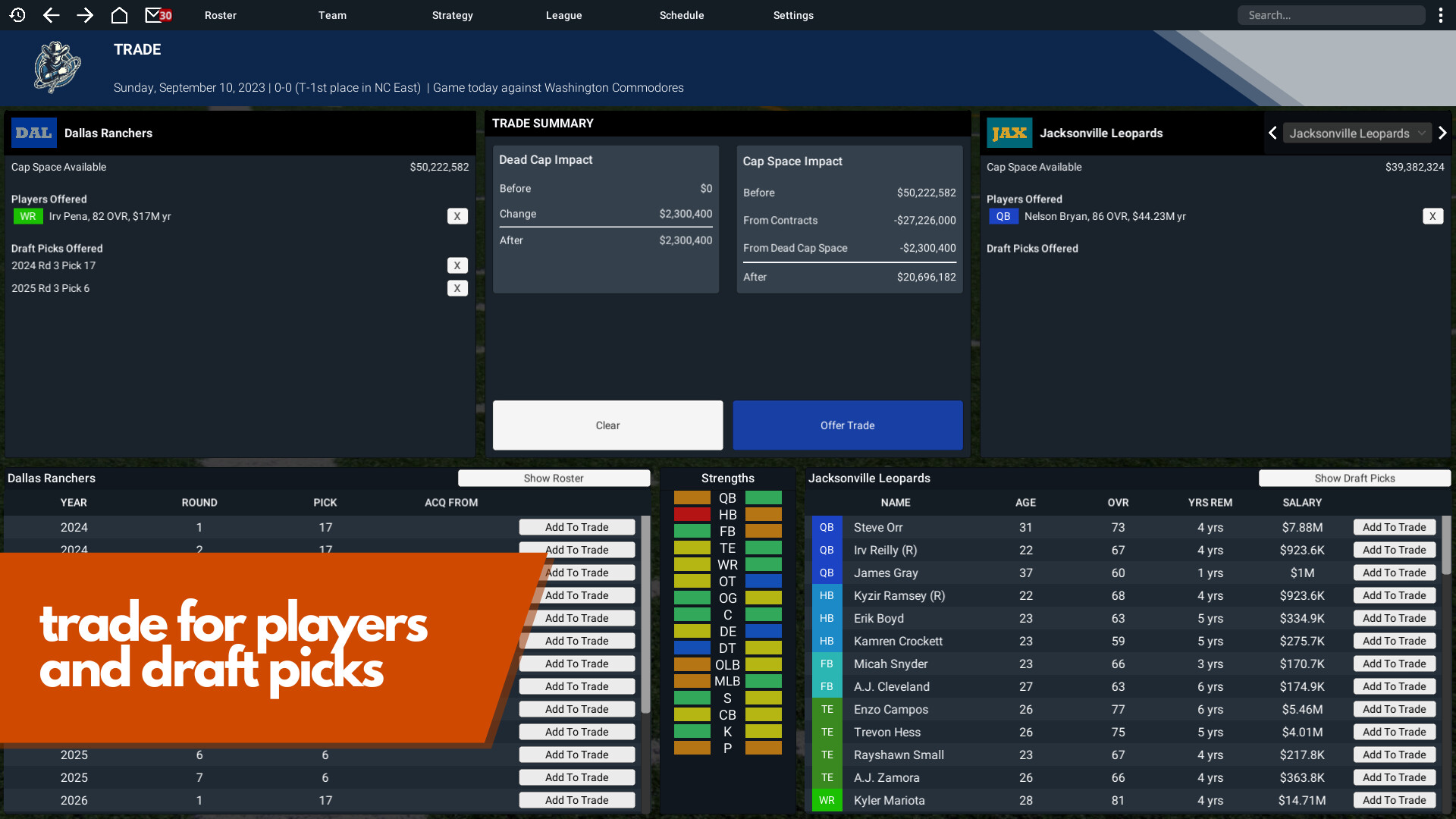 Football Legend drops you into a realistically modeled football universe. In this universe, you are head coach and general manager of a football team. You have total control over roster, personnel, and play calling duties. Compete with the other AI coaches and try to become the greatest of all time.