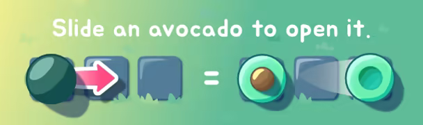 Use the 4 avocado pieces and their unique sliding mechanics to plant all of the seeds into the soil and water tiles. Order of operations is key, and using the pieces in clever ways is often the only way to solve the puzzle. Some seemingly easy levels will have you completely stumped until you get a very satisfying 'Aha!' moment where you see the solution.EXPERIENCE