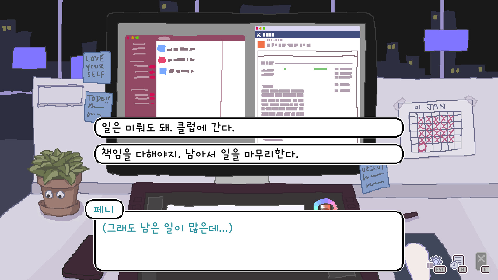 기업의 평사원인 페니가 월요일까지 프로젝트 업무를 마쳐야하는 게임. 프로젝트 업무로는 총 6개가 있고 (광고 기획안 만들기), 사무실을 돌아다니면서 아이디어를 얻고 프로젝트 그림을 만들어야하는 게임이다. 스토리가 직장인들이 겪은 문제들을 게임에서 잘 녹여내었는데, 특히 일을 미루는 모습에 대해서는 가끔식 본인의 모습이 투영되는 것도 보여서 뭔가 씁슬하면서도 웃겼던게 포인트였던 게임. 중간중간에 미니게임을 넣어놓은 것도 꽤 괜찮았고 (중간에 이야기가 너무 뜬금포로 간다거나, 도전과제 관련해서 진행해야하는 핸드폰게임은 노가다가 극심해서 이점은 별로였다.) 전체적인 그림체도 괜찮아서 재밌게 즐길 수 있었다. 무엇보다도 한글화가 잘되어서 이 재밌는 스토리를 편하게 볼 수 있었다는 점이 매우 좋았다. 회사 생활을 즐겼던 분들에게는 혹은 비슷한 경험을 하고 있는 대학원생, 연구원생분들은 이 게임을 하면서 어느정도 공감을 할 수 있을 것 같고, 그렇지 않은 분들도 간접체험을 해볼 수 있을 것 같은 생각이 드는 게임으로, 그 속에서 일을 하면서 생각하는 상상속의 일들을 체험해볼 수 있는 가볍게 하기 좋은 게임이라고 생각된다.