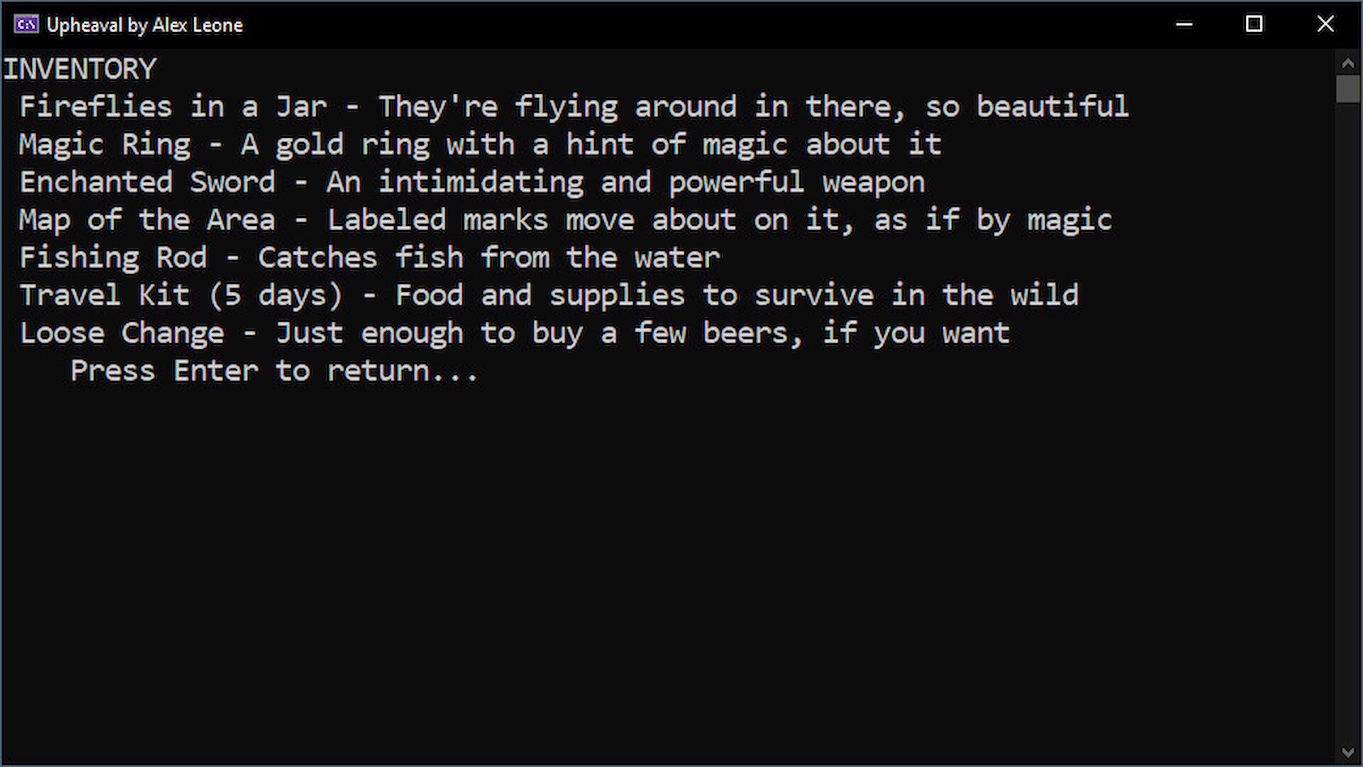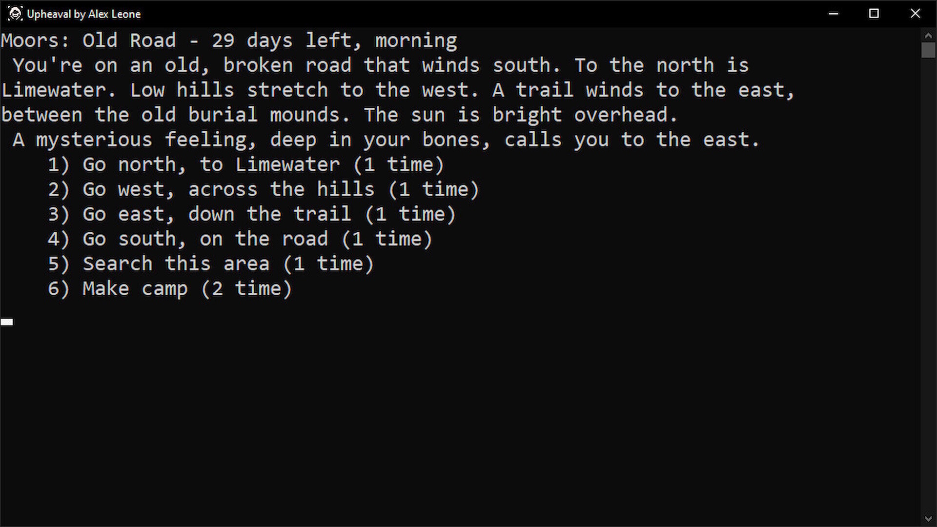 Upheaval is a text-based open world fantasy adventure roguelike centered around a remote village.