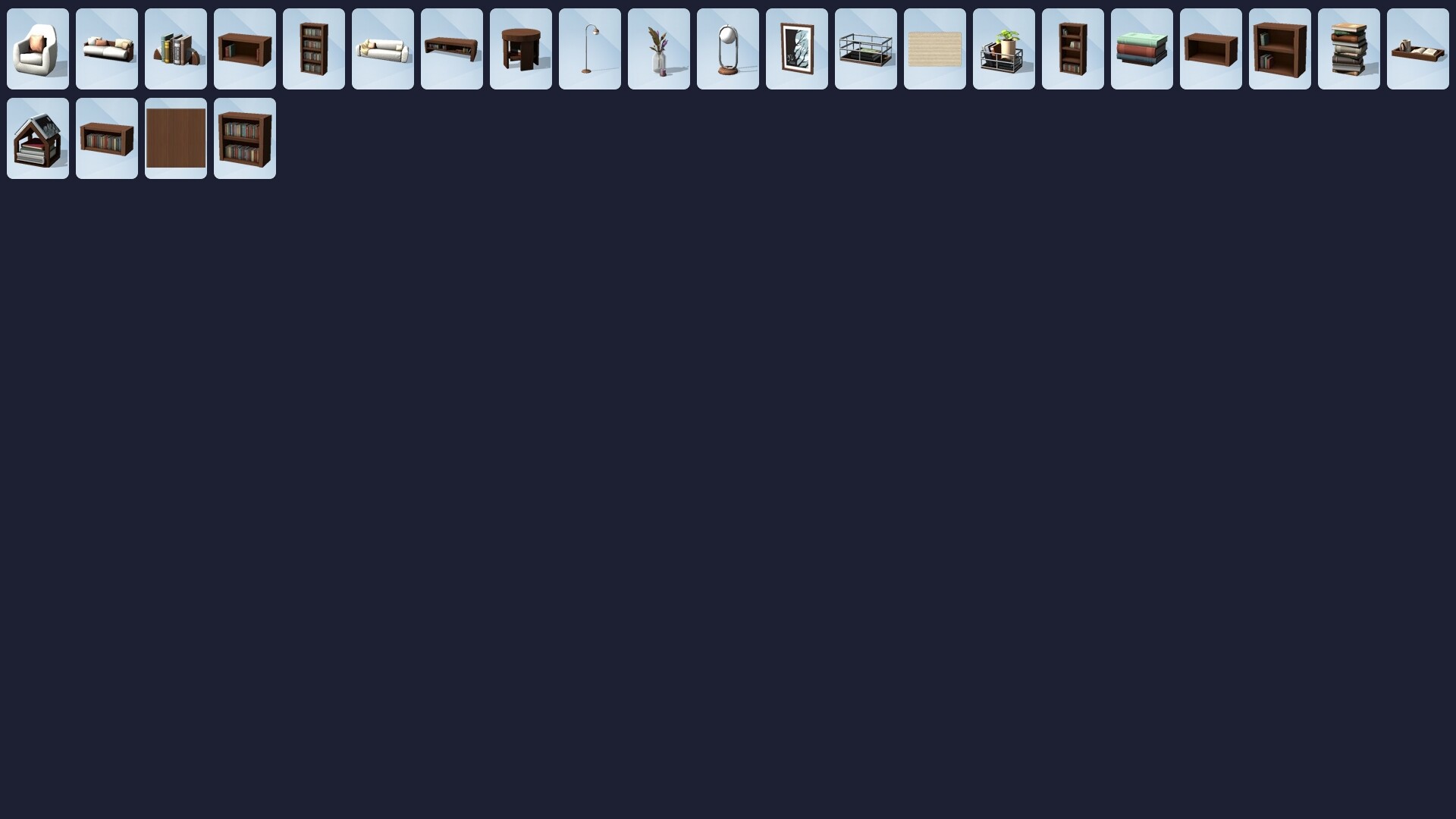 - 독서가의 휴식 — 채광이 좋은 창가 자리나 구석의 아늑한 은신처 등에 책꽂이와 장식을 배치하세요. 심의 스타일에 맞게 책장을 쌓아서 놓을 수 있습니다.