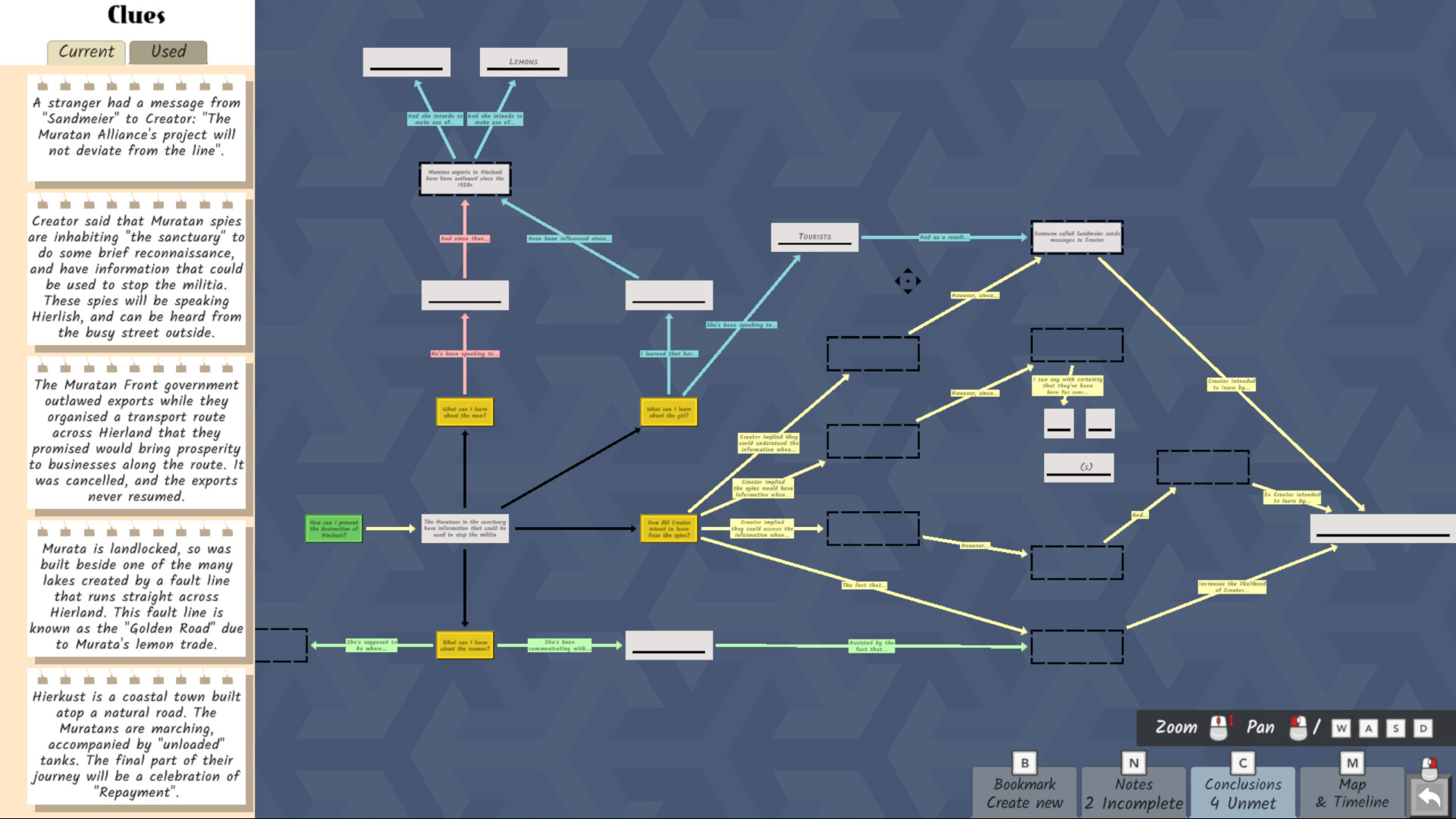 Acquiring clues is just the start. The real detective work comes from combining parts of those clues together into a logical argument that reveals further revelations. This is represented using nodes on a diagram, where answering one question can lock in nodes that will assist with a different question, allowing you to constantly build on prior conclusions as you progress.
