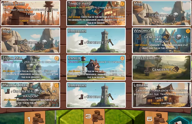 - Tile and Worker Placement - Manage your coins wisely! You get 6 per turn, use them to buy tiles in the Marketplace and hire workers to generate resources used to earn Victory Points!