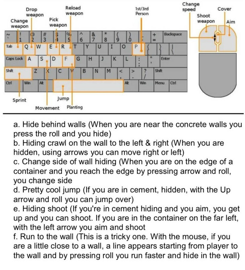 f. Run to the wall (This is a tricky one. With the mouse, if you are a little close to a wall, a line appears starting from player to the wall and by pressing roll you run faster and hide in the wall)