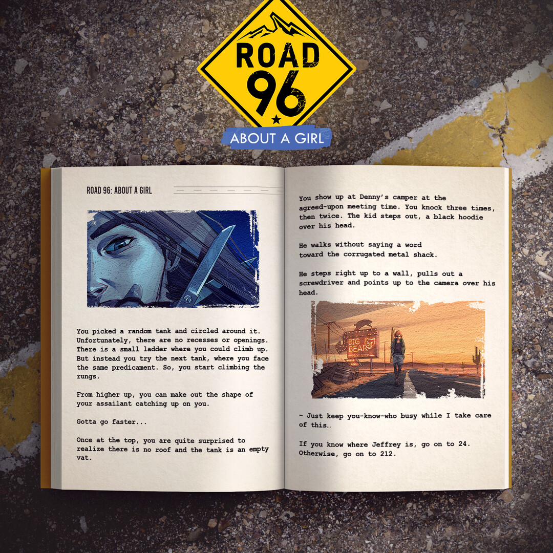 이 게임 북의 시간대는 Road 96: Mile 0의 결말 바로 뒤 시점이며, Road 96의 줄거리로 연결됩니다.