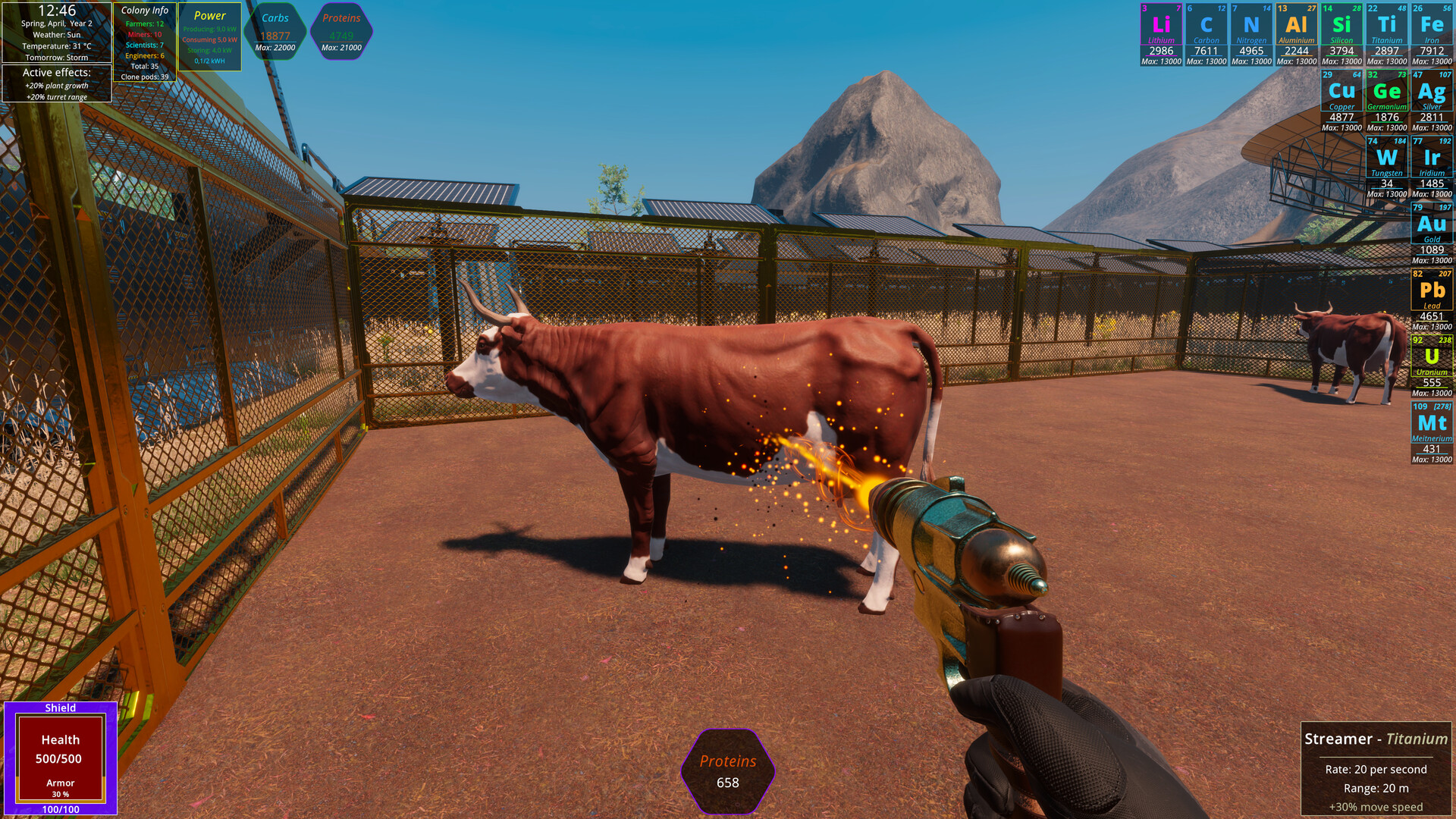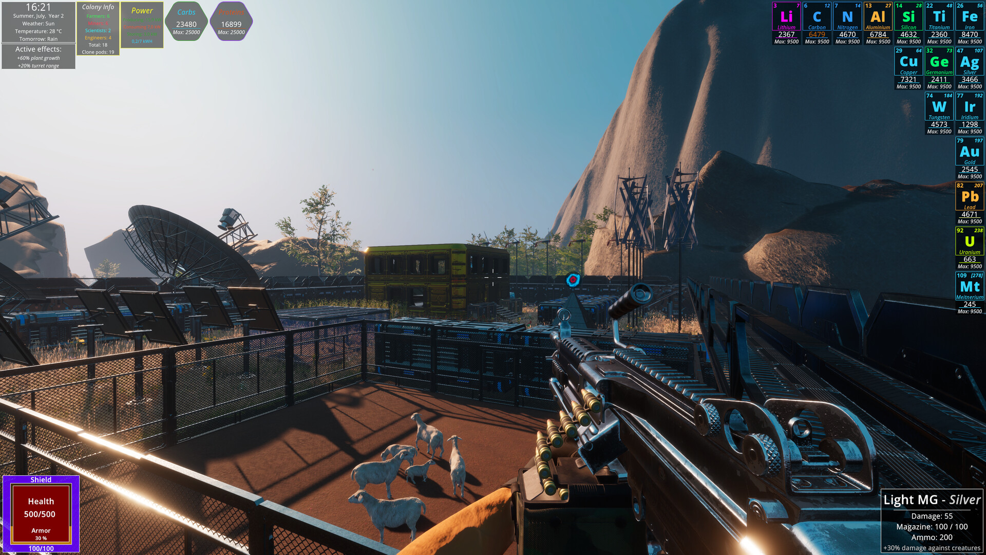 Seven metals (iron, copper, titanium, silver, tungsten, gold, and iridium) alter the properties of weapons, turrets, and other buildables crafted from them.
