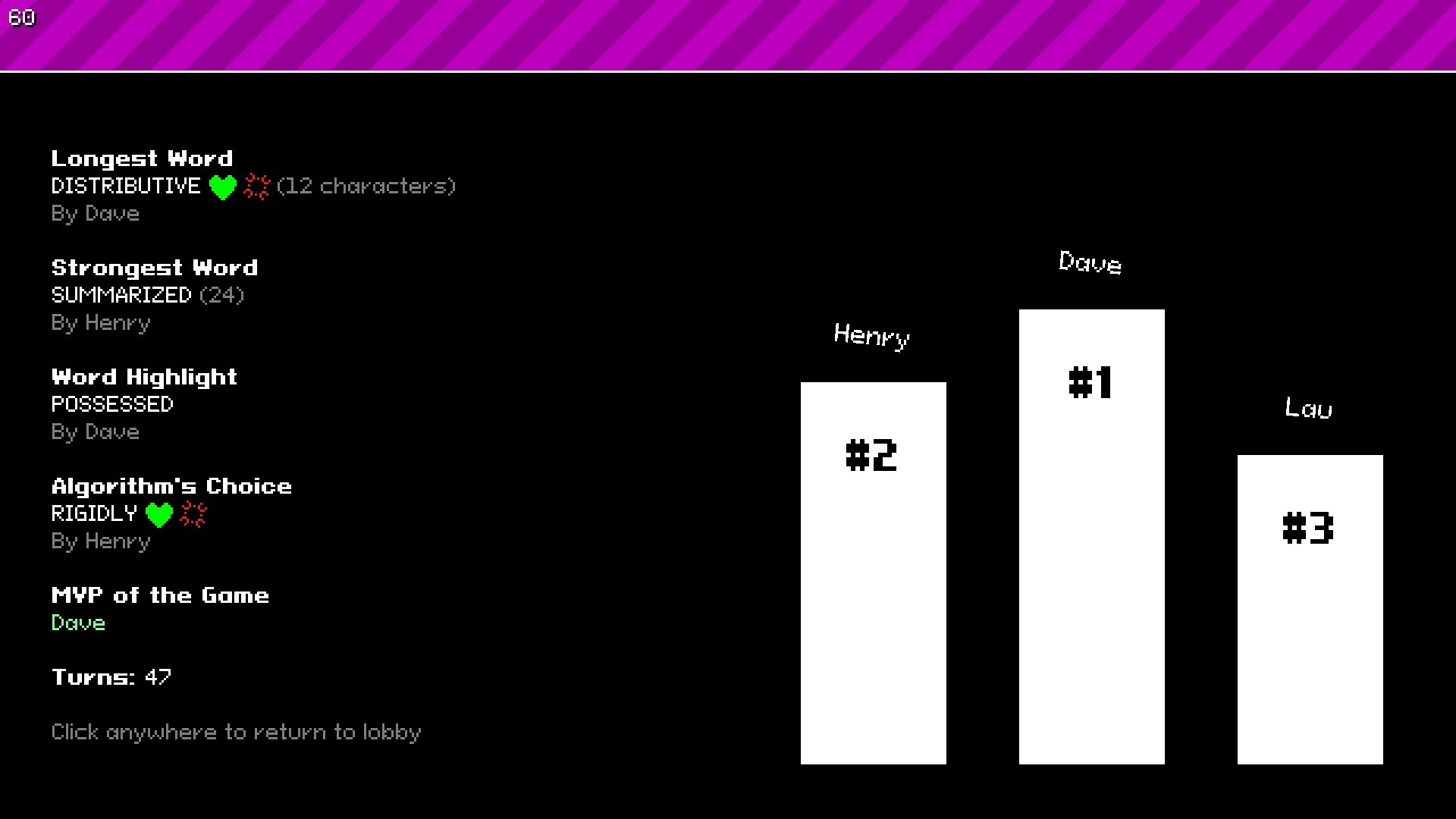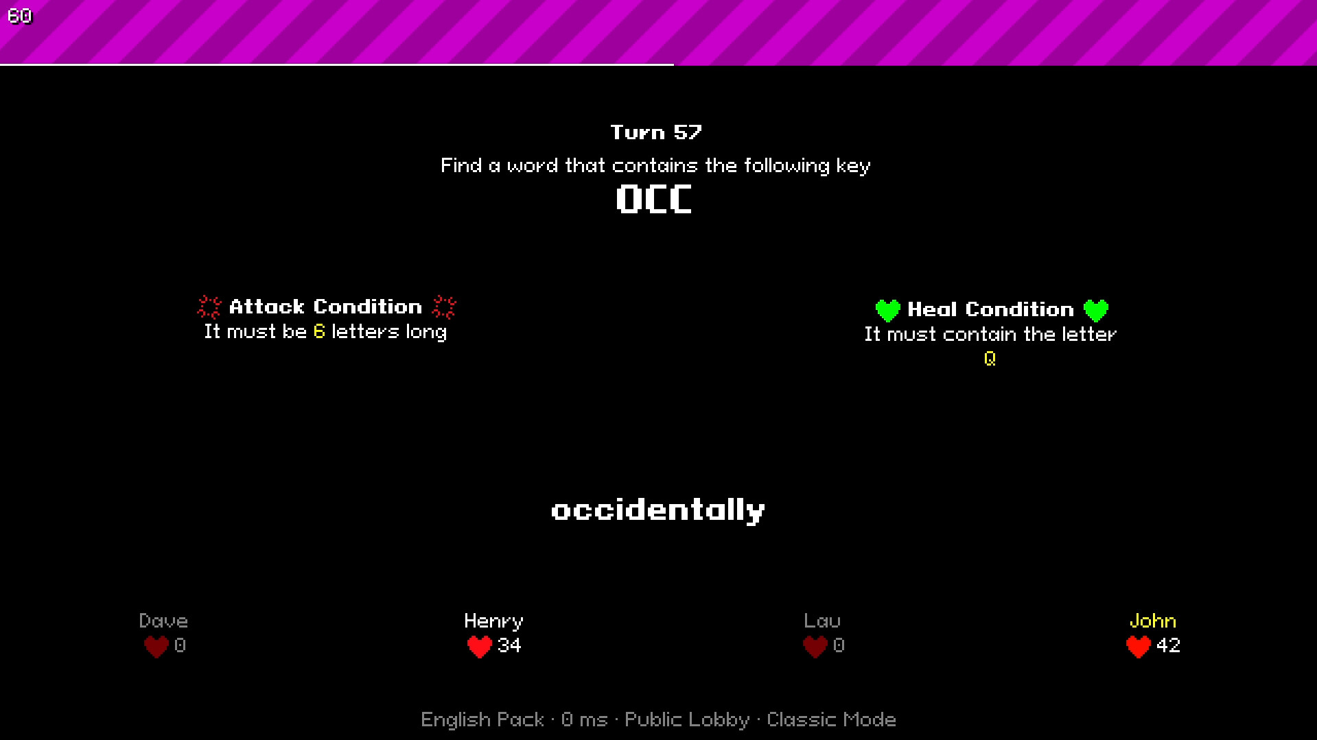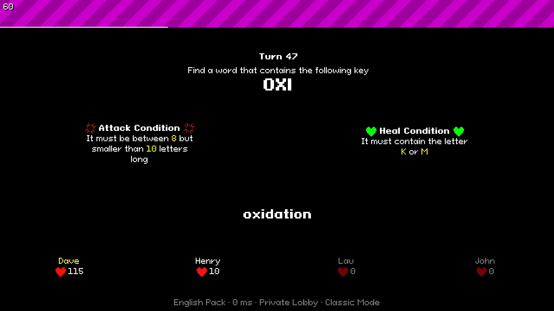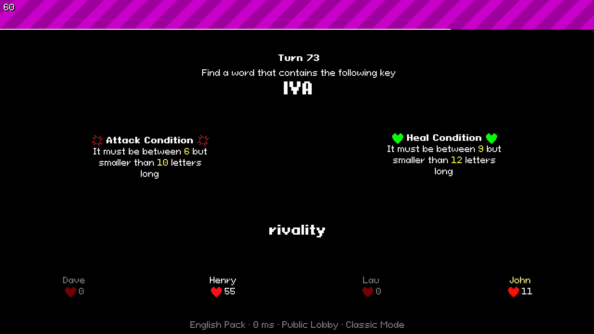 By turns, each player must find a word that contains a certain 3-letter key quickly. Additionally, if the word meets certain criteria, you can attack the rest of players or heal yourself (or both at the same time). Each words is valued by their letters, rarer letters have bigger values than common ones, ranging from 1 to 10.Available in various languages