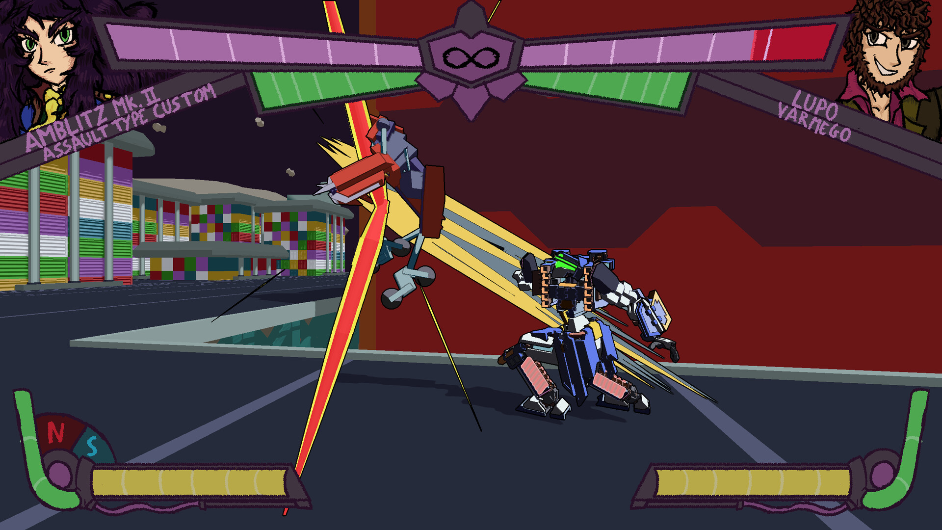 Choose your mech! More than 20 mechs are available for versus mode, and you can unlock non-competitive variations through the story mode!