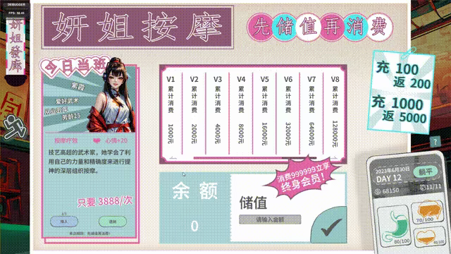 Players can't directly use cash to massage, but need to "recharge money", recharge 100 to get 200, recharge 1000 to get 5000, this is to tease the setting of VIP card in life, you can also accumulate the total consumption to increase your membership grade. Does this setting look familiar? However, this is just a stand-alone game, you don't need to pay for it, it's just a joke.