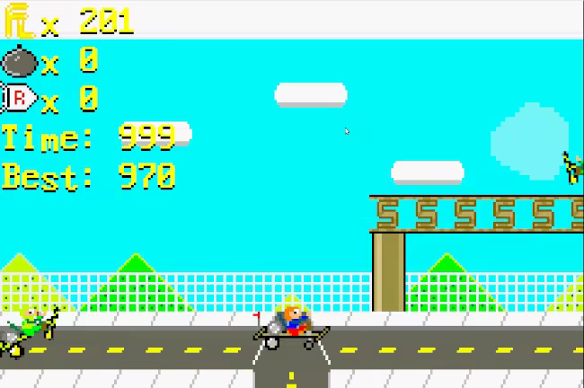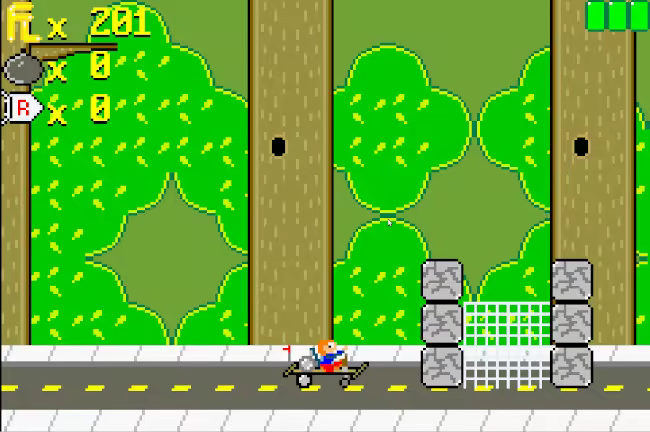 The Trail Hogs is a bicycle jousting game. Right now it is a 2D platform game similar to Super Mario except that you joust your opponent, whom is also on a bicycle, by running into him very similar to bumper cars. These bikes are also equipped with springs behind the rear axle to allow them to jump similar to a pogo stick, hence the high jump. In the game you ride a bike and battle opponents who have taken over various areas.The game consists of a main hub world called Hog Haven - a bicycle city. From there the player looks for secret passages and warp while upgrading their bike in order to fight the ringleader of the Skidmarks bicycle gang, The Pork.