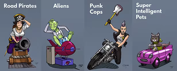 ⯀ 15 Character classes including: Pizza Driver, ER Doctor, and Telemarketer.