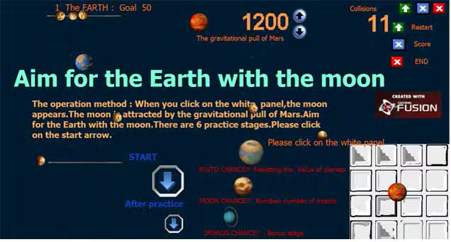 When you want to relieve stress, you should try this game. What you need is just clicking on the white panel. You can feel a sense accomplishment when you reach higher score. Also you can feel refreshing when you hit planets with the moon. There are a lot of ways to enjoy this game. For example, you can play this game to aim the best record by myself. Of course it is great to compete with your friends or family members. I’ll tell you how to play this game. There are two icons whose shape looks arrows on the startup screen. When you click the arrow-shaped icon under “START”, you will move to the practice stage. When you click the arrow-shaped icon under “The explanation screen”, you will get information about the operation.