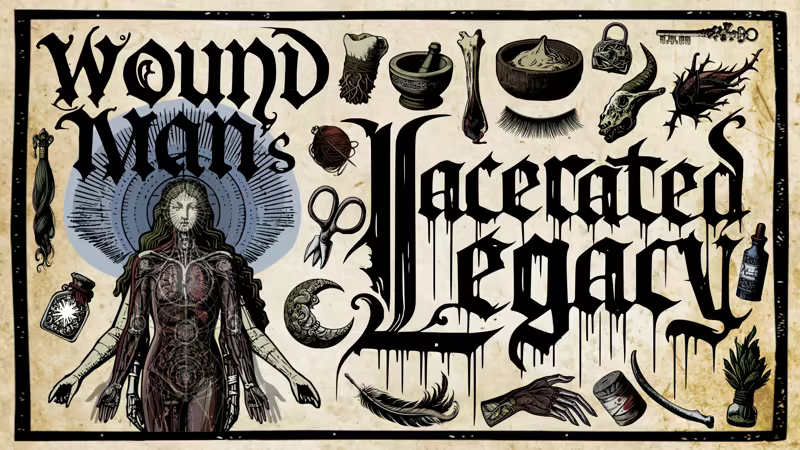 "Wound Man is a tulpa, brought into existence by humanity’s thoughts. He has persisted for centuries as the embodiment of medical drawings crafted throughout the ages. Initially formed by master anatomists to bestow vital information upon medics, healers, and surgeons, he has become the soul of all nameless medical diagrams of the male form.
