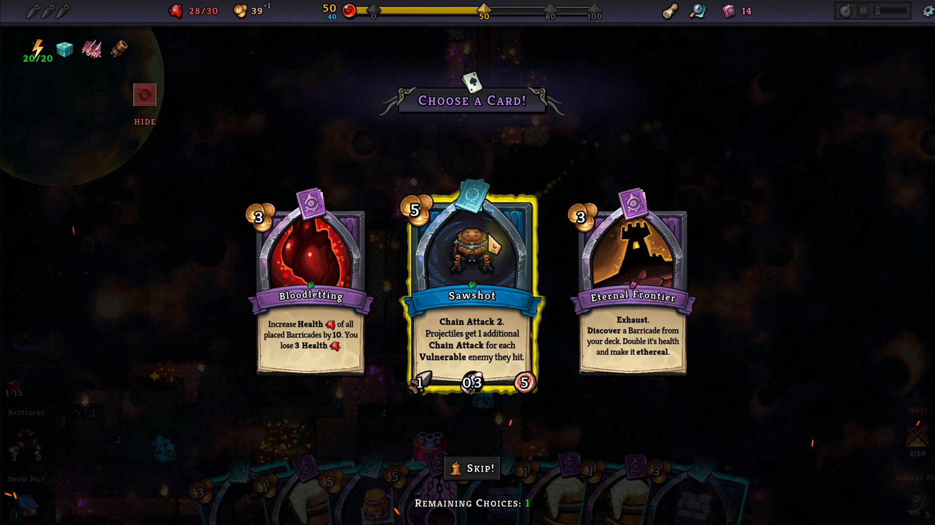 각 런은 작은 시작 덱을 사용하여 시작하며, 진행 중인 런에서 주기적인 보급품 드롭과 채굴 중에 발견한 보물을 통해 추가 카드를 획득하여 이 덱을 성장시킬 수 있습니다. 한 행성에서 목표를 달성하면 이후 런의 시작 덱을 위한 새로운 옵션으로 카드를 잠금 해제됩니다. 이는 전반적인 전략을 근본적으로 바꿔놓을 수 있습니다. 자신의 능력을 강화하고 마법을 사용하여 더 효율적으로 채굴하고 방어하는 데 집중할까요? 혹은 적의 이동에 영향을 주는 바리케이드를 우선순위에 두어 적을 킬박스로 유도할까요? 아니면 상태 효과와 방어 건물을 조합하여 덱에서 가능한 모든 대미지를 짜내어 막대한 무리를 물리치시겠습니까?