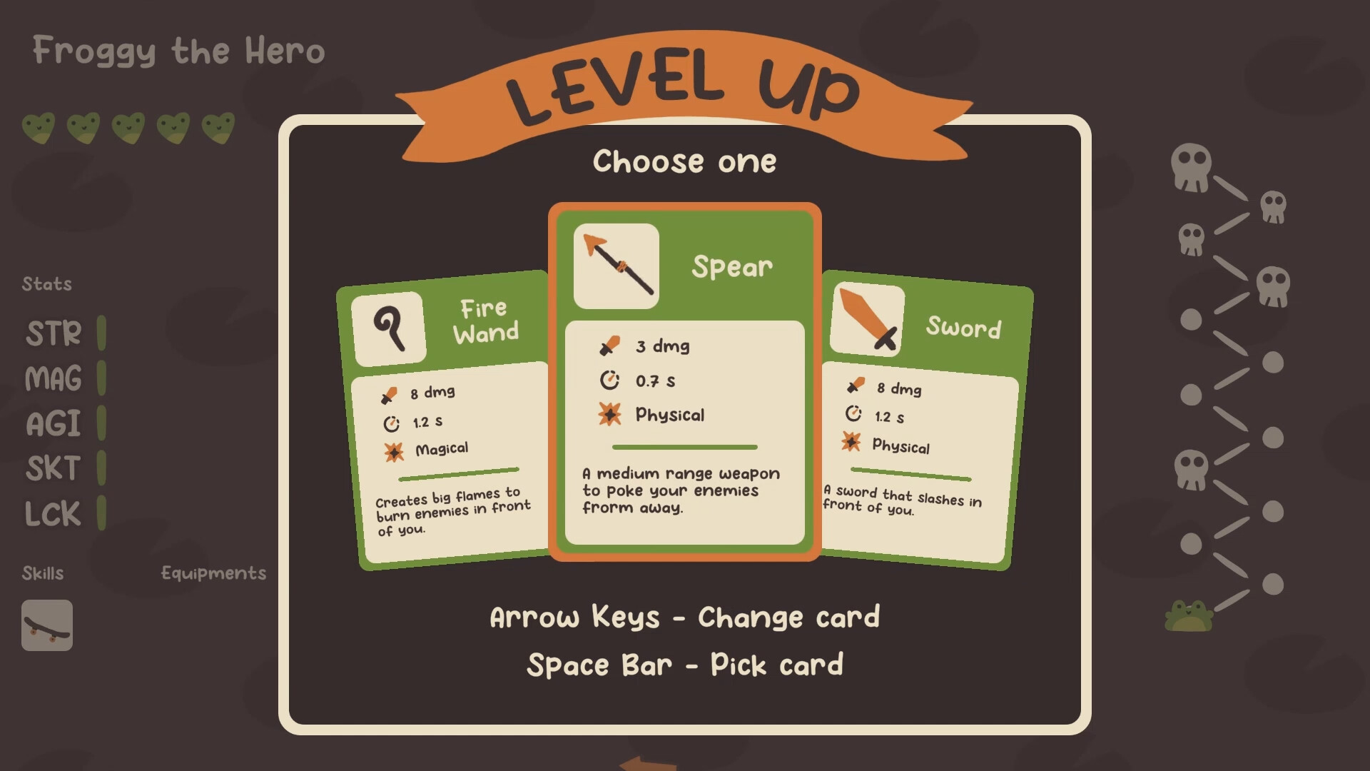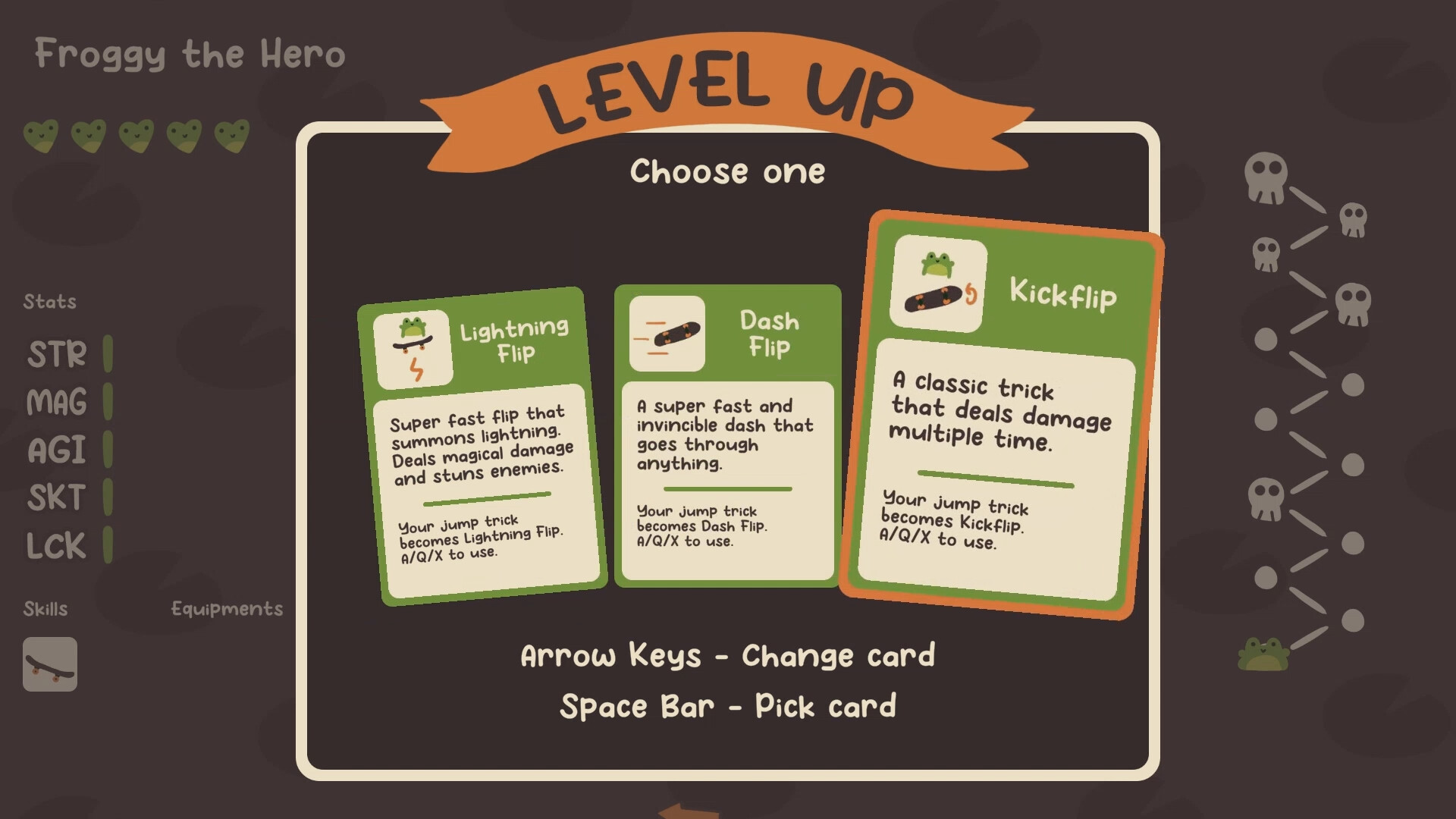 스케이트탄 깨구락지 스케이트타고 좌우로 빙글빙글 돌아다니는 개구리입니다. 원형의 맵에서 빙글빙글 돌다가 나쁜 개구리있으면 몸통박치기를 이용해 공격을 하여 처치하죠. 나쁜 개구리들은 올챙이녀석도 있고 데굴데굴 구르는 녀석도 있고 점프를 하는 녀석도 있습니다. 나무 막대기에 올라서 아래에 번개를 일으킨다거나 공중을 날아다니면서 몸에 번개를 두른 녀석도 있죠. 또한, 보스로 크게 크게 점프를 하면서 넓은 면적으로 공격을 가하는 녀석도 있습니다. 최종 보스는 2개의 다리와 혀를 이용하면서 부하 개구리들을 소환하죠. 이들에 맞서 기본적인 몸통박치기 외에도 슬라이드를 통해서 적의 공격을 회피할 수 있고, 점프를 하며 뛰어 넘는 것도 가능합니다. 점프의 경우에는 공중에 있는 적들을 공격하는 용도로 쓸수도 있어서 잘만 쓰면 회피와 공격을 동시에 할 수 있는 기술입니다. 그렇게 능력을 동원하여 모든 적을 처치하면 보물 상자가 등장하고 여기서 3가지 보상 중 하나를 고를 수 있죠. 보상은 장비 또는 스탯 보상이 주어집니다. 장비는 무기와 방어구로 구분되는대 대부분 무기이고 방어구는 방패와 투구 2종류만 존재합니다. 방어구는 적의 공격을 1회 막아주는대, 매 라운드마다 회복되기에 방어용도로 유용한 보상이죠. 무기는 물리 또는 마법 대미지를 가지며 인정한 간격으로 공격이 발동하는 형태입니다. 근거리의 적을 공격하는 형태도 있고 멀리있는 적을 공격하는 무기들도 존재하죠. 다른 보상인 스탯 보상은 크게 5종류의 스탯을 상승시킬 수 있습니다. STR은 물리 대미지와 스케이트 대미지 보너스이고 MAG는 마법 대미지와 스케이트 데미지 보너스. AGI는 공격 속도와 투사체 대미지 증가, SKT는 이동속도와 스케이트 대미지 증가. LCK는 크리티컬 확률이 증가하면서 행운이 상승하여 보상에 보너스 스탯 옵션이 붙어서 등장할 수 확률이 올라가죠. 장비나 스탯 보상 외에도 체력을 증가시키면서 잃은 체력을 회복시켜주는 보상도 존재하고, 첫번째 보스를 처치하면 스케이트 스킬을 하나 고를 수도 있습니다. 점프할때 번개가 친다거나 착지할때 범위 피해를 입힐 수 있는 효과도 있고, 스케이트 모드를 플립하면서 연속적인 대미지를 주는 스킬도 있습니다. 위쪽으로 크게 점프를 하거나 즉시 순간이동을 하는 스킬도 있죠. 개인적으로는 플립이 좋음! 플레이를 하면서 달성하는 업적에 따라서 새로운 아이템들도 언락됩니다. 일반 모드를 클리어하면 하드모드도 언락되어 플레이 가능해지죠. 아쉬운 점 -볼륨이 그리 크지 않음 (무기의 종류도 강화의 방향도 가짓수가 많지 않음) -보상 외에 변수없음 (등장하는 적의 종류 등 고정)