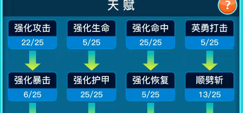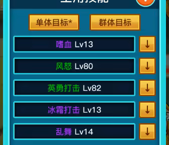 收集一定数量的技能碎片自动升级。可以配置两套技能(单体、群体),战斗中会根据敌人数量不同自动更换。每个技能有不同的释放概率,会优先释放靠上的技能。