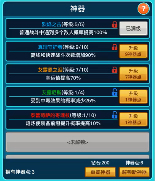 使用神器点可以解锁或升级神器,使用钻石可以重置所有神器。点击对应神器上的锁头图标可以锁定,避免被重置。