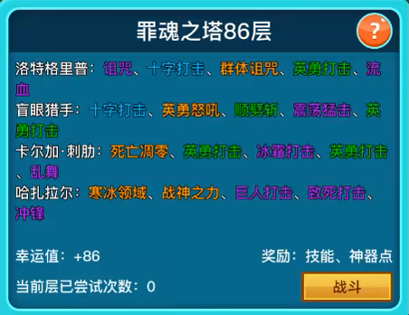 罪魂之塔战斗胜利可以获得神器点和幸运值,幸运值越高获得的装备和伙伴品质越高。500层首领是整个游戏最难的关卡。