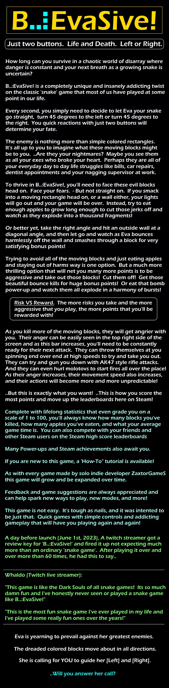 Welcome to a world of dangerous rectangles where quick reflexes and maneuvering will help you keep breathing... Well, for at least a few more seconds! Two buttons. Life or death. How long can you survive? Okay, so you died. Try Again. Die. One more time. Die. Just one more. Die. One more!