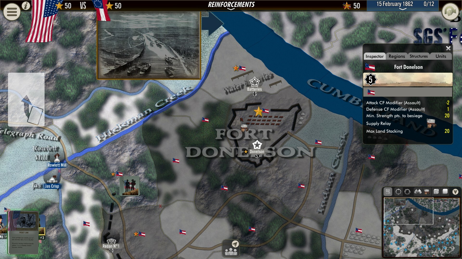 SGS Battle for Fort Donelson is a tactical game, the first in an SGS series dedicated to the great battles of the American Civil War (1861-1865). With a new gameplay specially created and designed to simulate the characteristics of the armies and battles of the period, it recreates, at infantry regiment scale, with a turn-based system representing one hour and zones of around 300 meters, the few days of fighting around Fort Donelson, on the banks of the Cumberland River in northwest Tennessee, in February 1862.