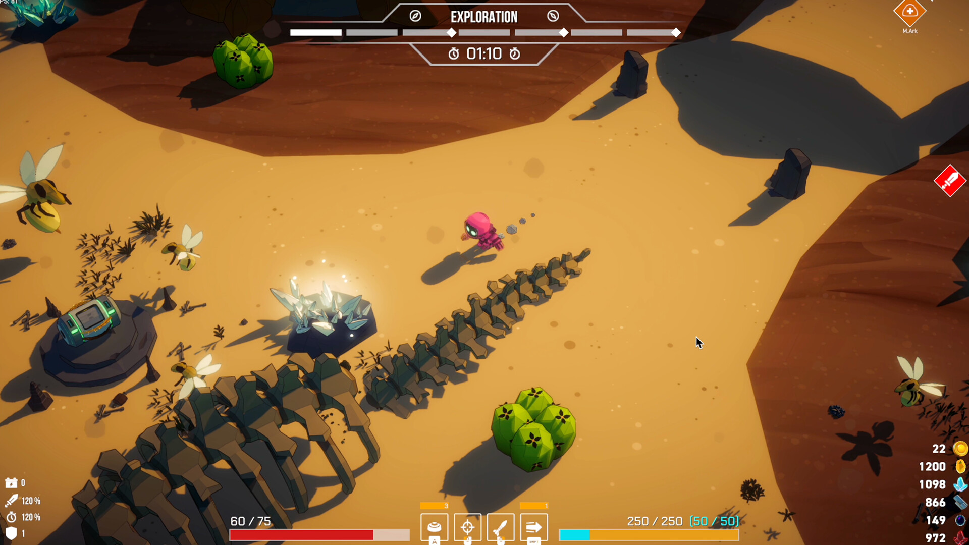 몬스터 파도 사이에는 잠깐의 휴식 시간이 주어집니다. 이는 주변 환경을 탐험하여 방어 구조물을 건설하거나 크리터의 통계를 향상시키는 데 필요한 귀중한 자원을 수집할 수 있는 기회입니다. 그러나 주의하세요! 이 휴식은 짧을 것입니다! 항상 타이머를 주시하십시오. 타이머가 0이 되면. 다음 파도가 닥칠 것입니다. M.Ark를 무방비로 내버려 두지 마세요.