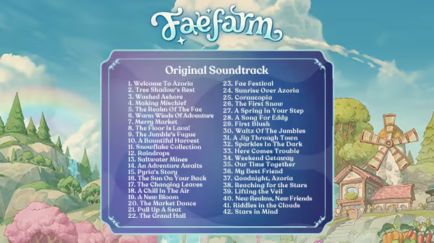 Relive your adventure in Azoria with Fae Farm's original soundtrack! The Fae Farm Official Soundtrack features 37 of the original tracks from the game and 5 bonus tracks from the "Skies of Azoria" add-on. Discover over an hour of the orchestral themes composed by Cris Velasco for your epic journey through the magical and vibrant world of Azoria, an Island full of wondrous biomes, endearing characters and fantastic creatures.