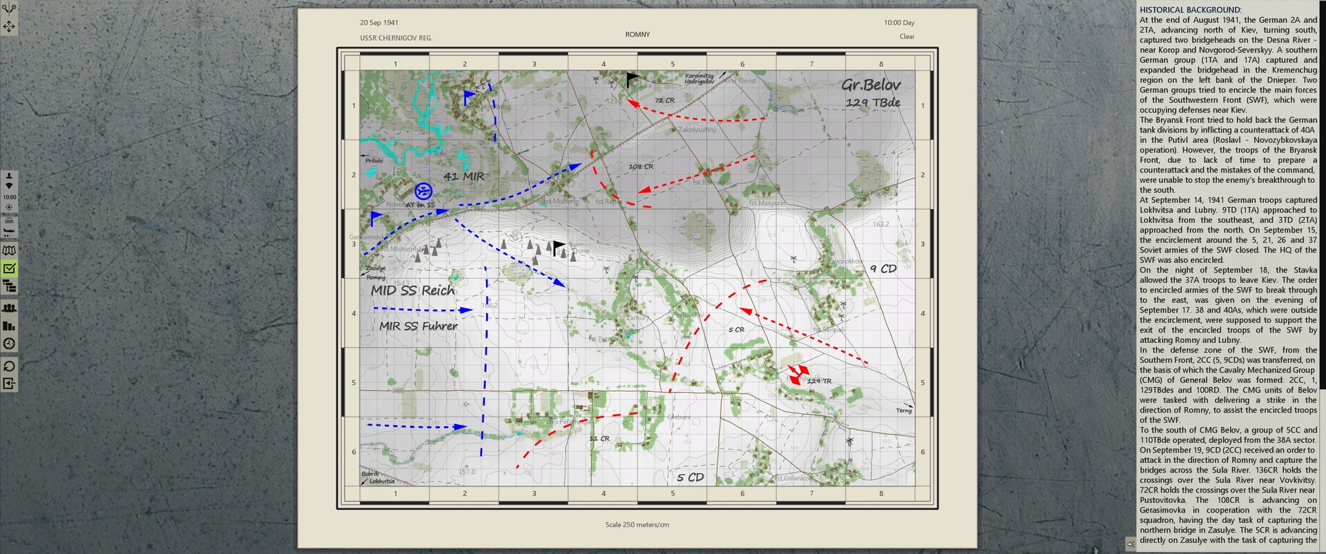 Soviet troops of the SWF were encircled near Kiev. CMG Belov received the order of advance to the Romny to provide support to the encircled troops. In order to prevent a breakthrough of the encirclement ring, the German HQ strengthened the outer perimeter with elements of 10MID and MID SS "Reich".