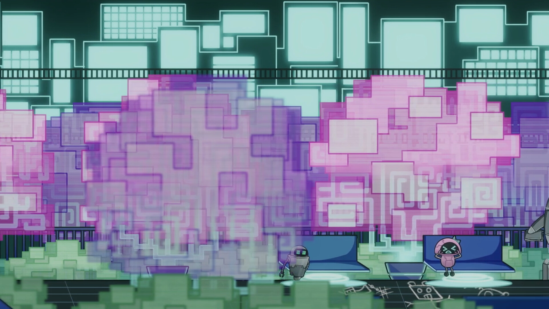 Robot Zizzy lives inside a TV screen, in a neon 2D world. One day he discovers that its inhabitants are missing. We are going to find out that the evil robot Magnus has kidnapped them.