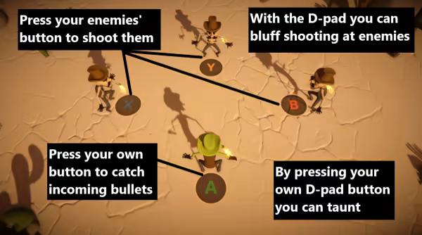 If another player shoots at you, quickly press your own button to catch the bullet. But be careful, pressing your button without being attacked will stun you for a short amount of time!
