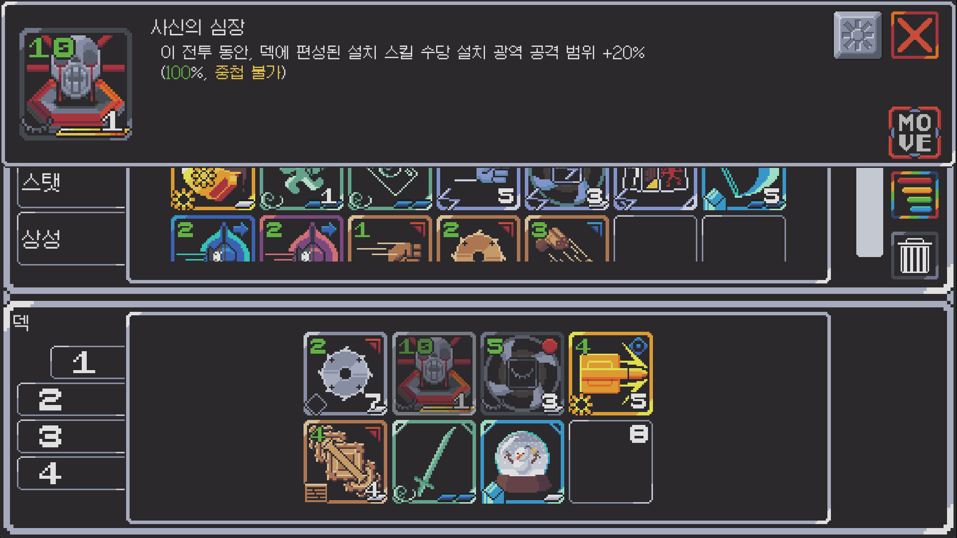 1. 전반적인 게임 플레이 로그라이크 장르는 곧잘 즐겼지만, 덱빌딩이 좀 낯설었는데요. 스킬들 종류가 다양해서 이것저것 사용해보는게 재미있네요. 스킬 아이콘들이 멋져서 수집하면서 뿌듯합니다. 게임이 크게 복잡하지 않으면서도 흥미로운 요소들이 많습니다. 적을 처치하는 것도 시원시원하고요. 캐릭터가 실명 상태가 되면 화면이 작아지기도 합니다. 맵마다 설명이 적혀있는데, 궁금한 장소들이 많아서 다 가보고 싶었습니다. 보드게임하듯 한칸씩 이동하면서 맵을 탐험해보는 것도 좋아요. 또, W버튼을 누르면 캐릭터가 위쪽으로 걷는게 아니라 비행을 합니다. 날아다니는게 소소하게 즐겁더군요. 일시정지 기능이 있어서 더 마음에 들었습니다. 게임하다가 다른 일이 생겨도 멈춰두면 돼요. 가볍게 한판씩 하기 좋은 게임을 찾고 있었는데 딱 좋네요. 2. 디자인 및 텍스트 귀엽게 잘 만든 도트 그래픽입니다. 캐릭터들의 개성이 뚜렷하며, 대기화면과 맵의 디자인도 아기자기하고 정교합니다. 소장욕구를 자극하는 게임이에요. 캐릭터 설명, 스토리 등 게임 내 텍스트들도 흥미롭습니다. 재미있고 독특한 설정의 NPC들이 많이 나오네요. 스테이지 시작마다 등장하는 NPC가 무슨 말을 하는지 하나씩 읽어보고 있습니다. 3. BGM 오래 들어도 피로하지 않으면서도 게임의 분위기에 잘 녹아듭니다. 특유의 8비트 음악이 게임 플레이를 흥겹게 해줍니다. 중독성 있네요. 이벤트 참여합니다.(완료)