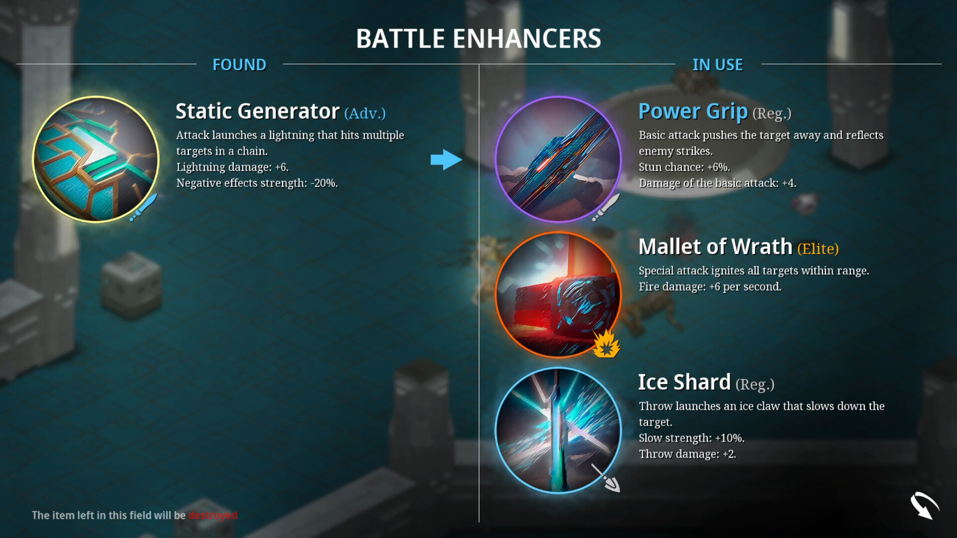 게다가, 특별한 능력을 부여해주는 강력한 과학 기술 기기인 "강화제"를 사용할 수도 있습니다. 불, 얼음, 번개, 에너지, 방어 등 다양한 옵션이 있습니다.