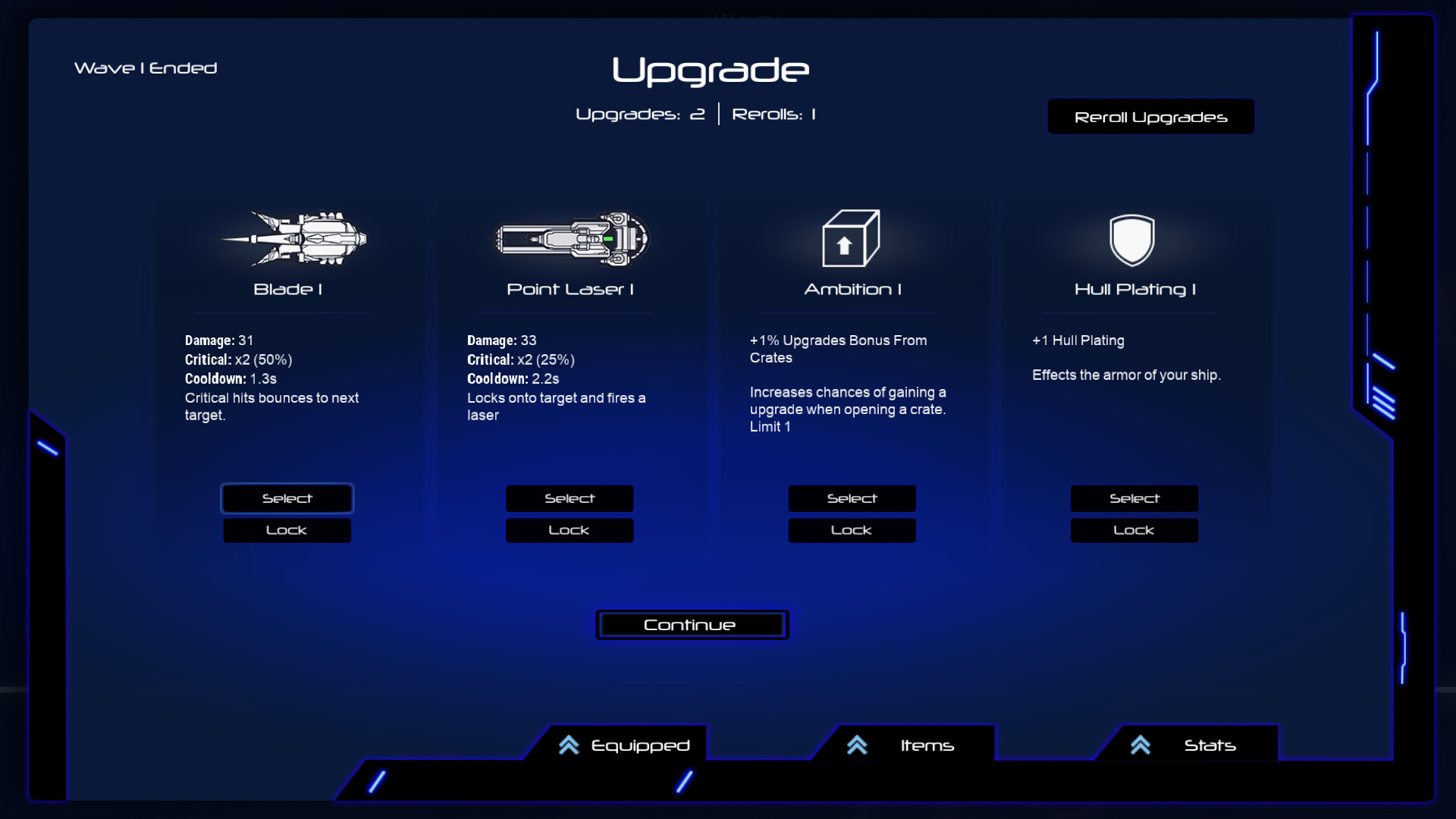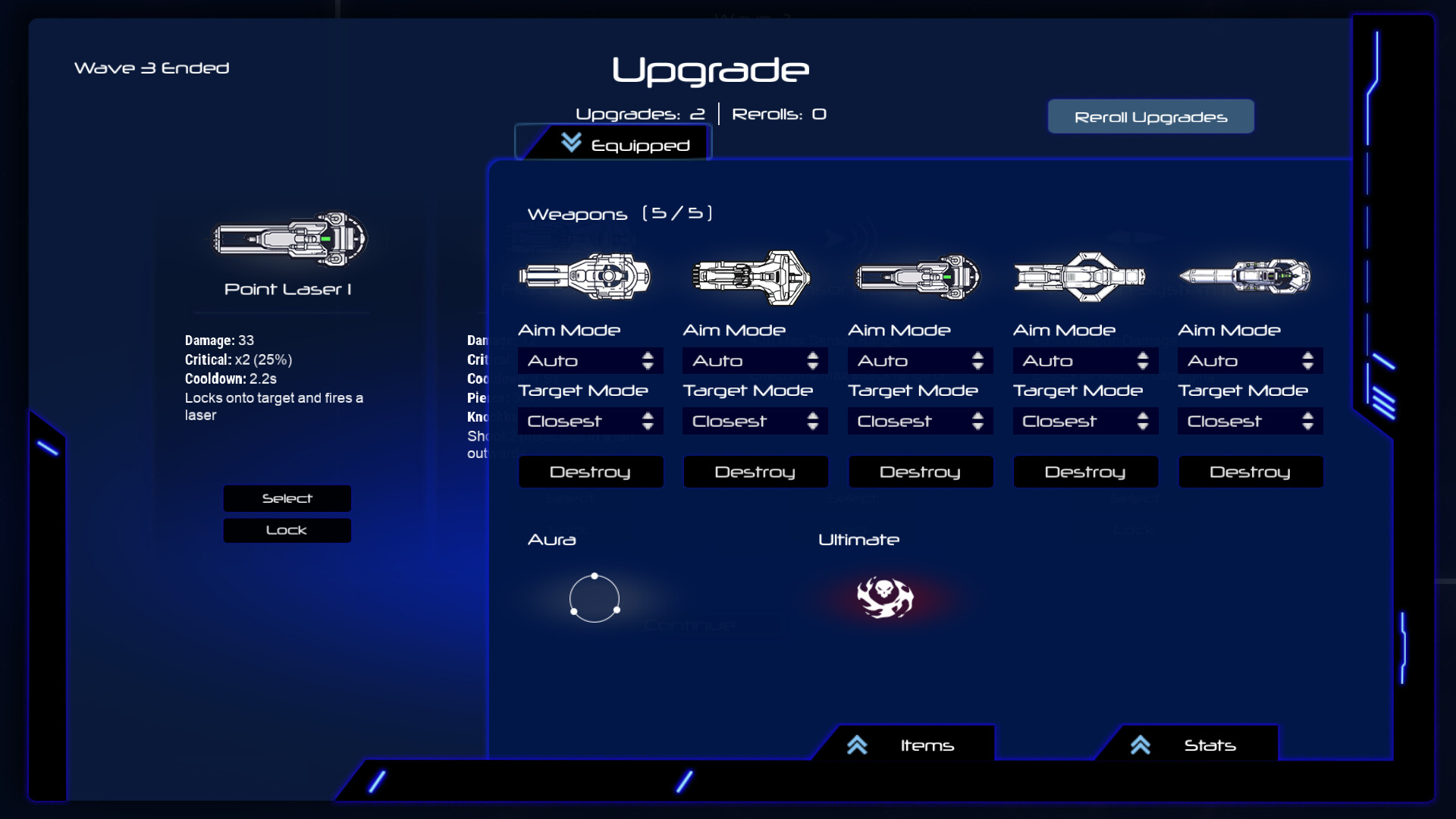 - Hundreds of upgrade stat items, weapons, and auras to choose from (Ion Beam Prism, Flak Cannon, Meteor Missiles, Shield, Burn Aura, and many more)