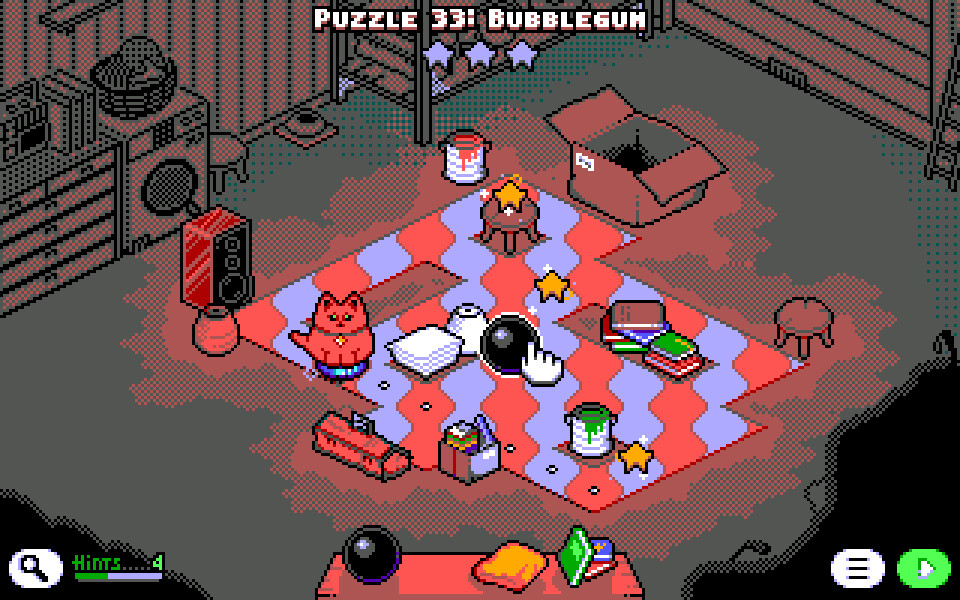 It's an MS-DOS puzzle game with EGA graphics, where you're tasked with placing objects on the playing field to route Broomba to collect all the stars. The Broomba might be a little faulty because it only makes a left turn when hitting something. In addition to static objects like books and boxes, there are flower pots, balls, and bottles, each with their own behavior and place in the puzzle. The levels gradually get harder, ensuring there's brain-racking to be had.