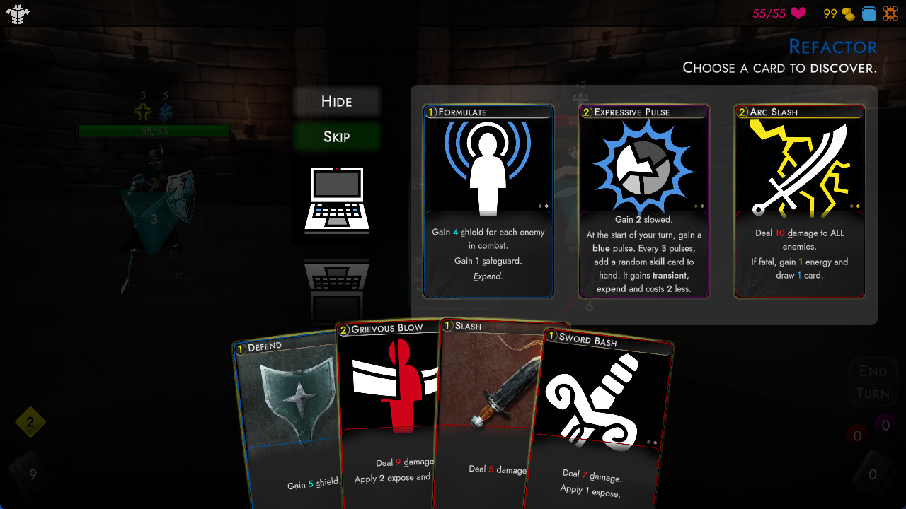 Select a new card to add to your deck at the end of each combat. Gain access to additional cards and strategies during random events.