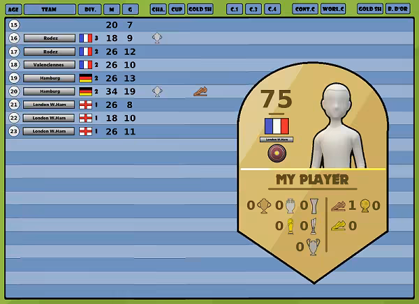 매 해마다 귀하의 진전을 관찰하고 이전 해와 비교할 수 있습니다. 팀 트로피와 개인 상을 모아 이 스포츠의 역사를 쓰세요. 귀하가 속한 디비전에서 시즌 최다 득점자가 될 수 있을까요? 아니면 더 나아가 유럽 골든 슈를 차지하여 전 세계 팀들에게 인상을 줄 수 있을까요? 어느 날은 충분히 강력해져서 축구 선수에게 주어지는 궁극의 상을 들 수 있을까요: 발롱도르?
