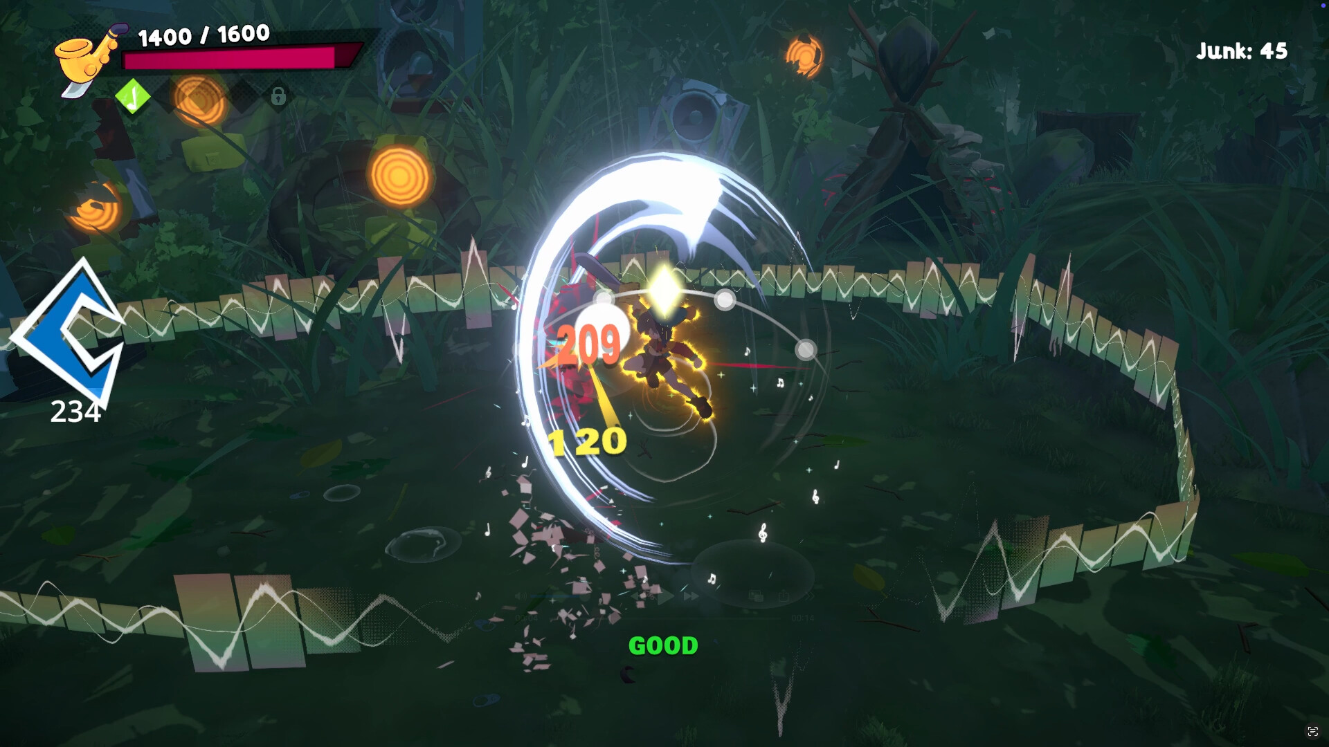 Time your attacks to match the beat and vanquish your foes! Combining rhythm and action gameplay, get rewarded for playing on the beat and crafting your combos to the music, but that means mixing it up too! Don’t just play on the major beats, use quick eighth notes and rests between your strikes to deliver punishing combos against your foes!