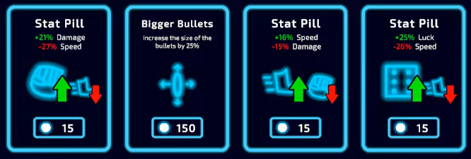 - Items: you can choose it to activate certain abilities, like bigger bullets.