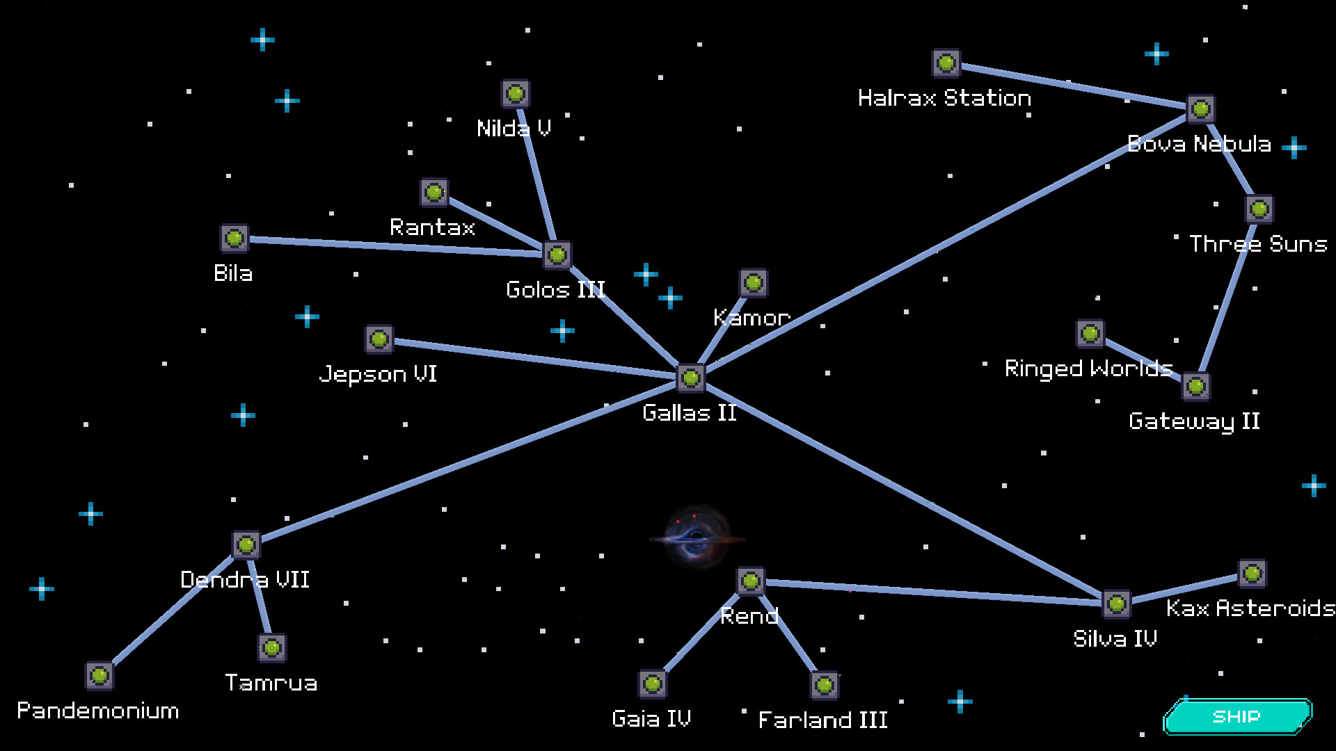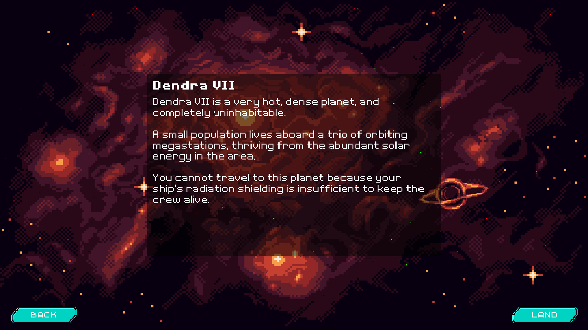 Twenty star systems await our heroes, ranging from worlds of ice, to lava, to asteroid belts, to stations orbiting uninhabitable worlds. Each system could hold some valuable material or technology to help them on their way, or just harbor terrible creatures that want to eat them. Many have both.