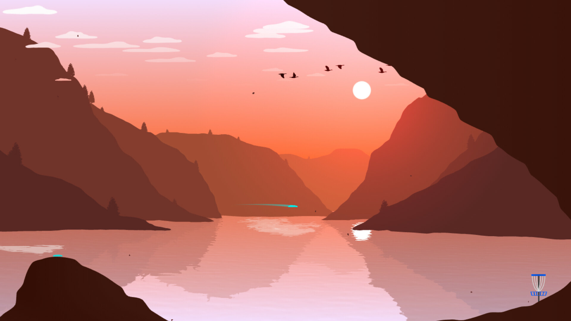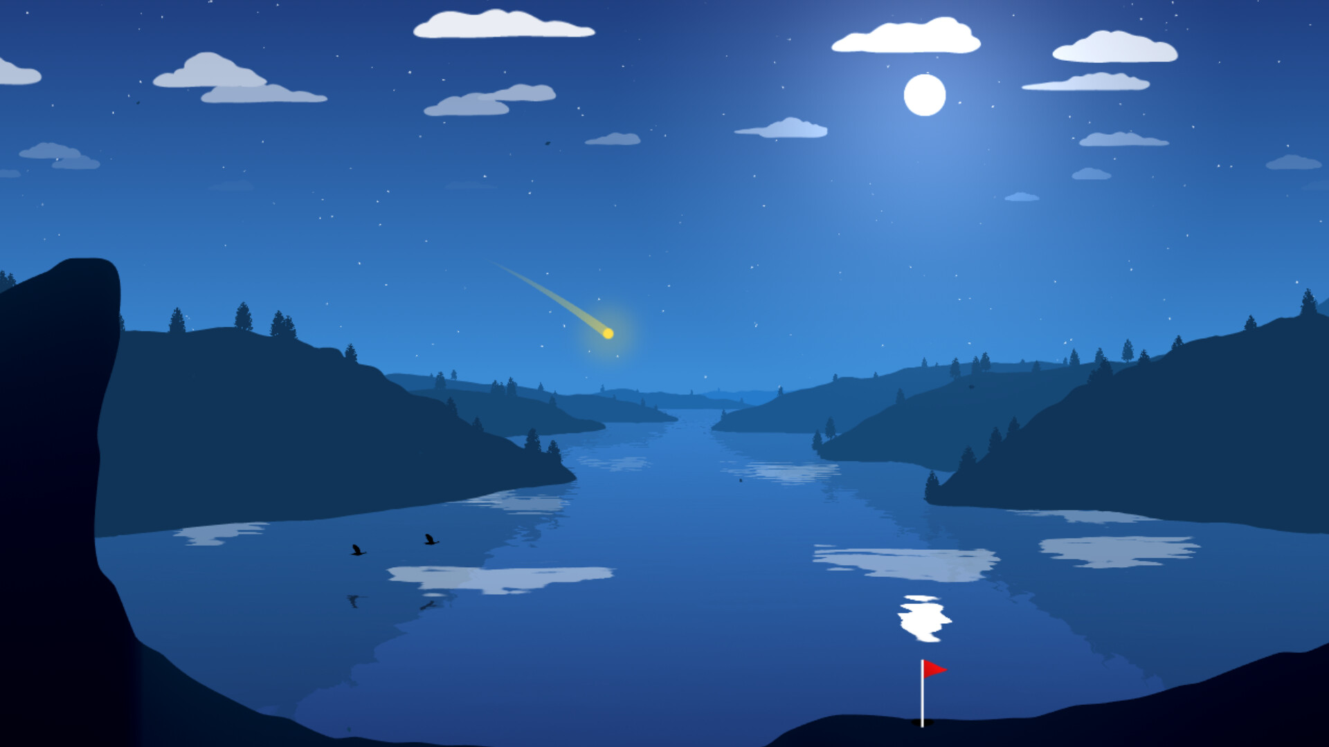 Stylized graphics beautiful designed art with flying birds, moving clouds, particles and water effects.