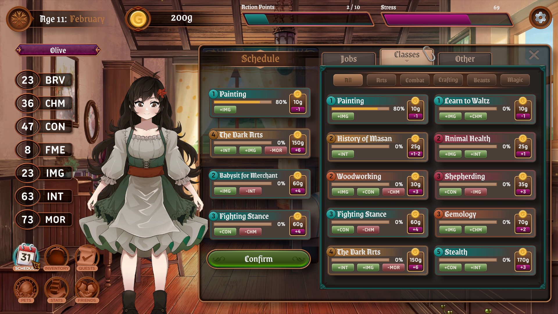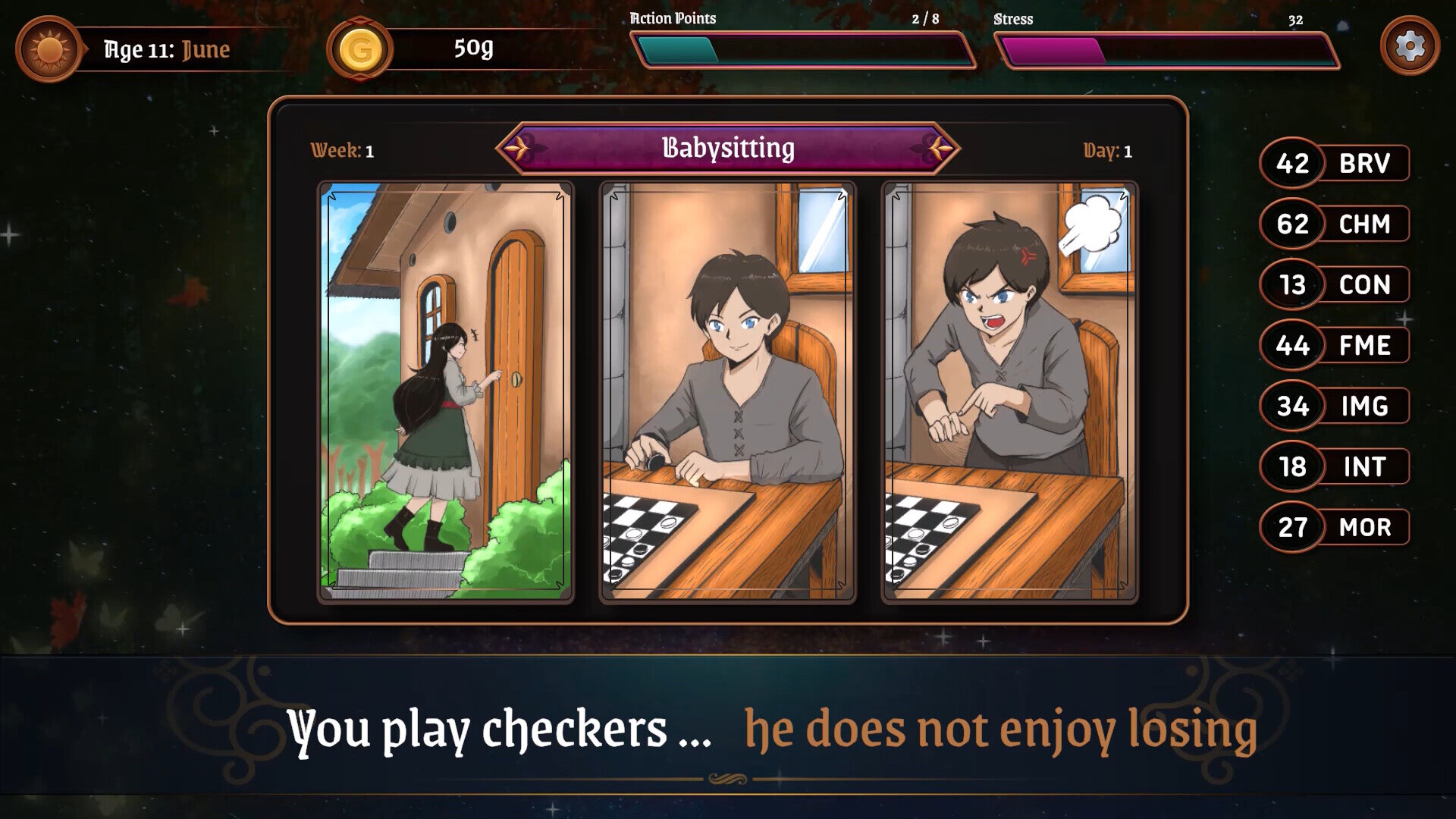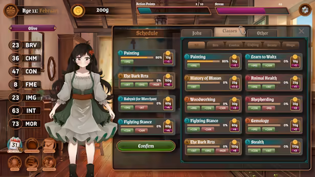 딸이 기술 트리 내에서 학습할 수 있는 다양한 직업을 탐색하세요. 각 직업마다 새로운 이벤트와 다양한 엔딩이 풀립니다.