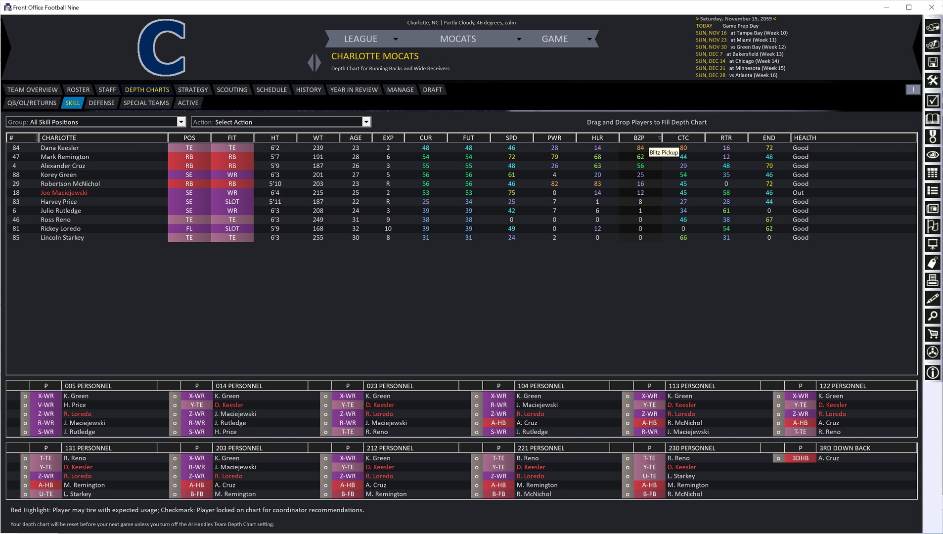 Depth charts. You can set every personnel grouping for your team, on offense and on defense. Front Office Football simulates games based on these charts.