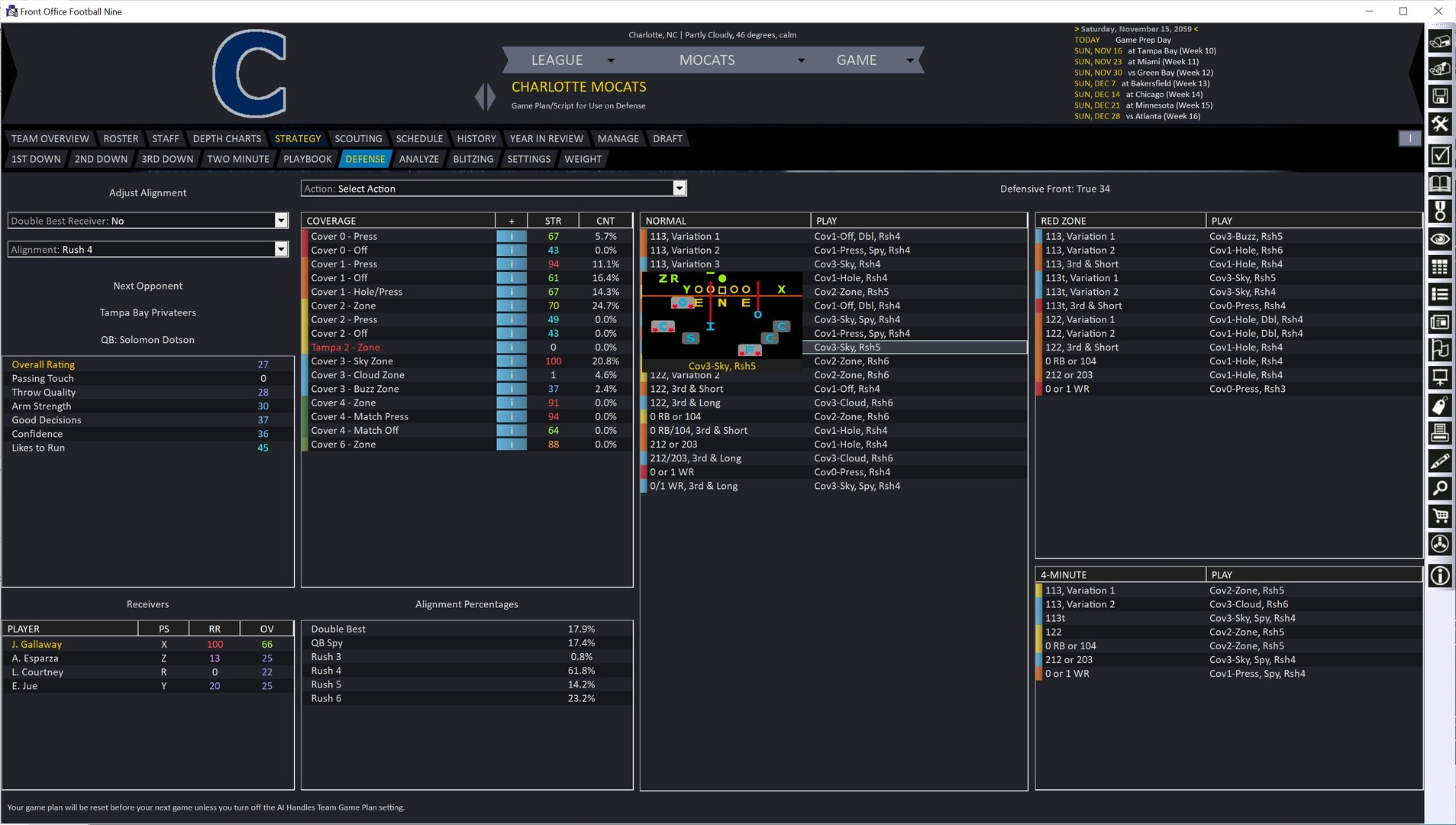 Game plans. The game plan will allow you to specify different strategies depending on the score of the game and how much time remains. You can create scripts of plays to use based on down, distance and field position. On defense, you select plays based on the situation and what the offense is showing. You can micro-manage every decision, or you can leave everything to your coaching staff.