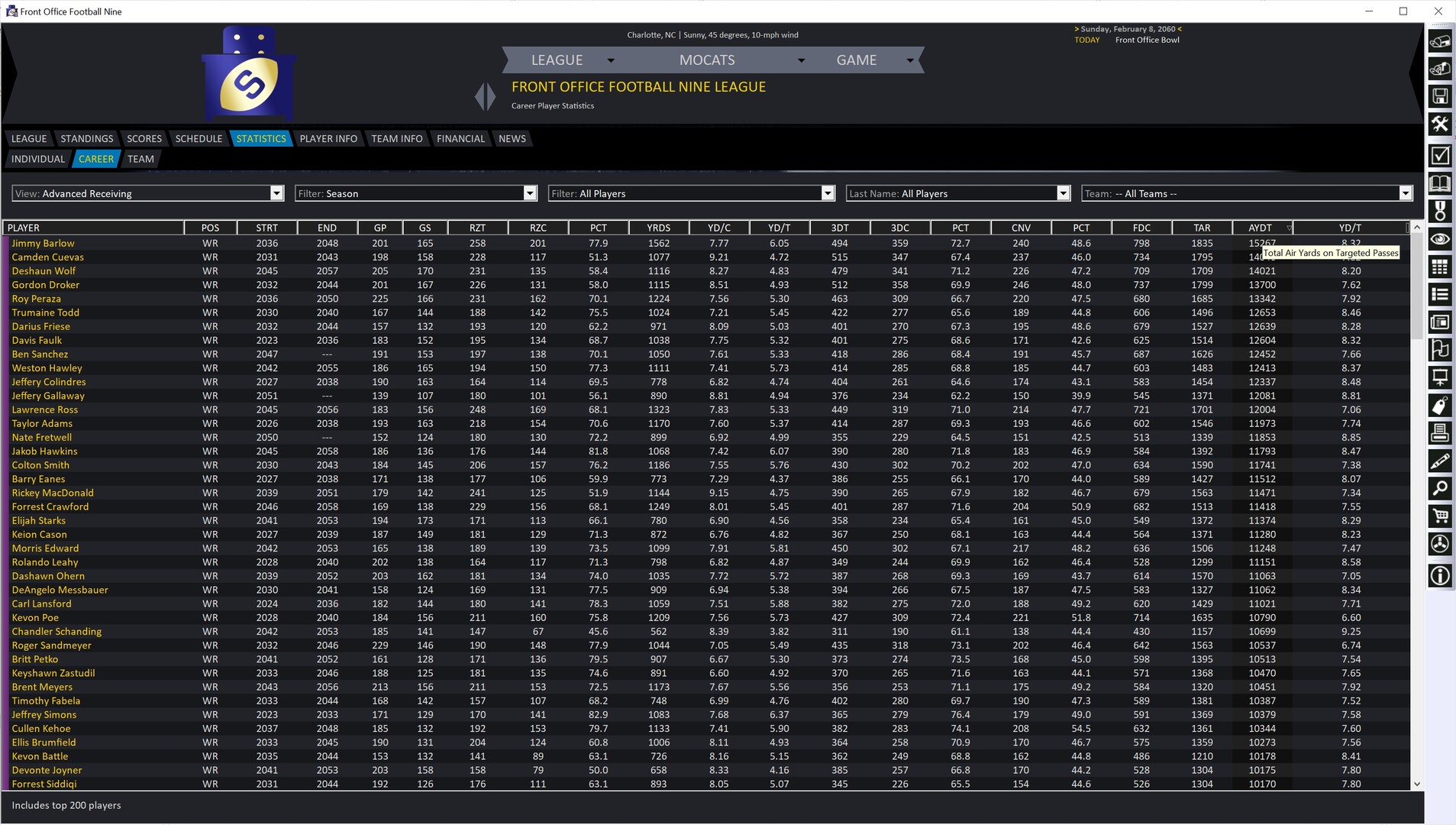 Modern New Statistics. For quarterbacks and receivers, the game tracks air yards and yards after catch. Learn who is really testing the defense. See how quarterbacks fare against the blitz. Learn which running backs have the highest percentage of successful runs.