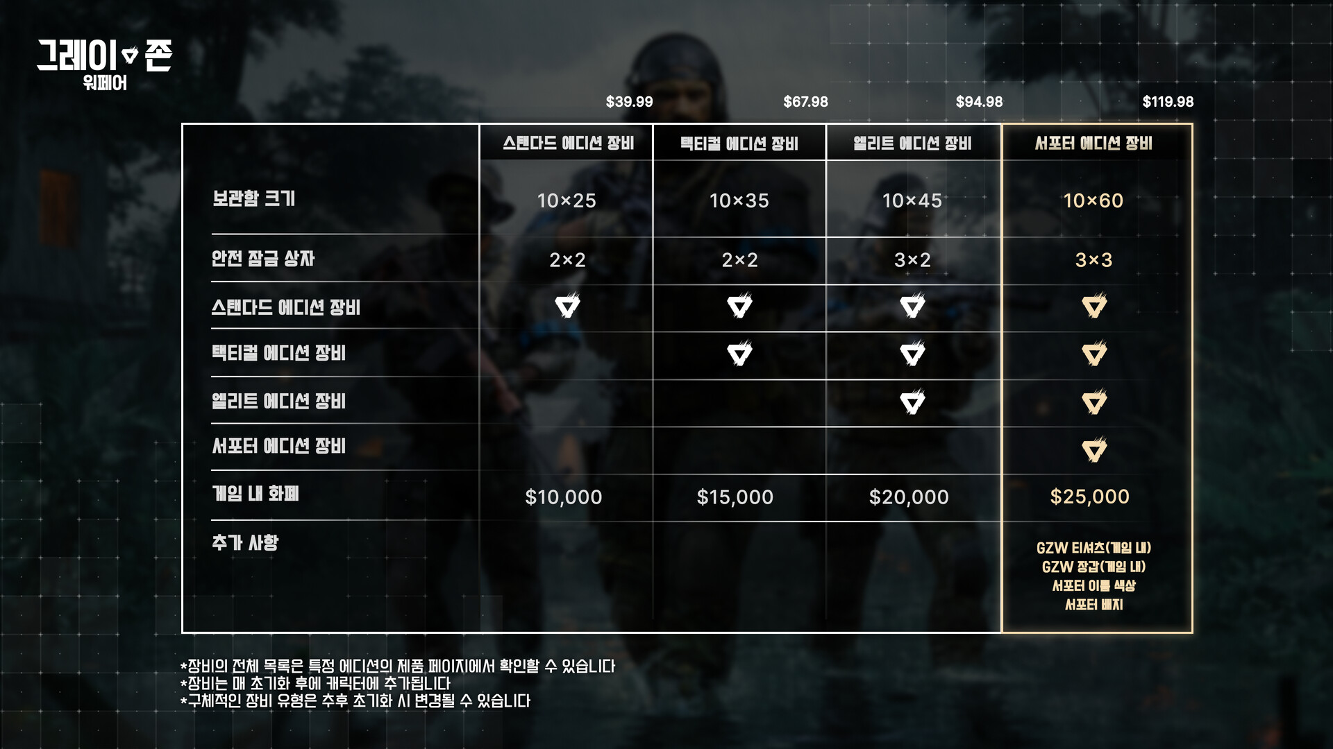 보너스 전술 장비, 확장 락커, 기본 금고를 챙겨 여정을 업그레이드하세요.