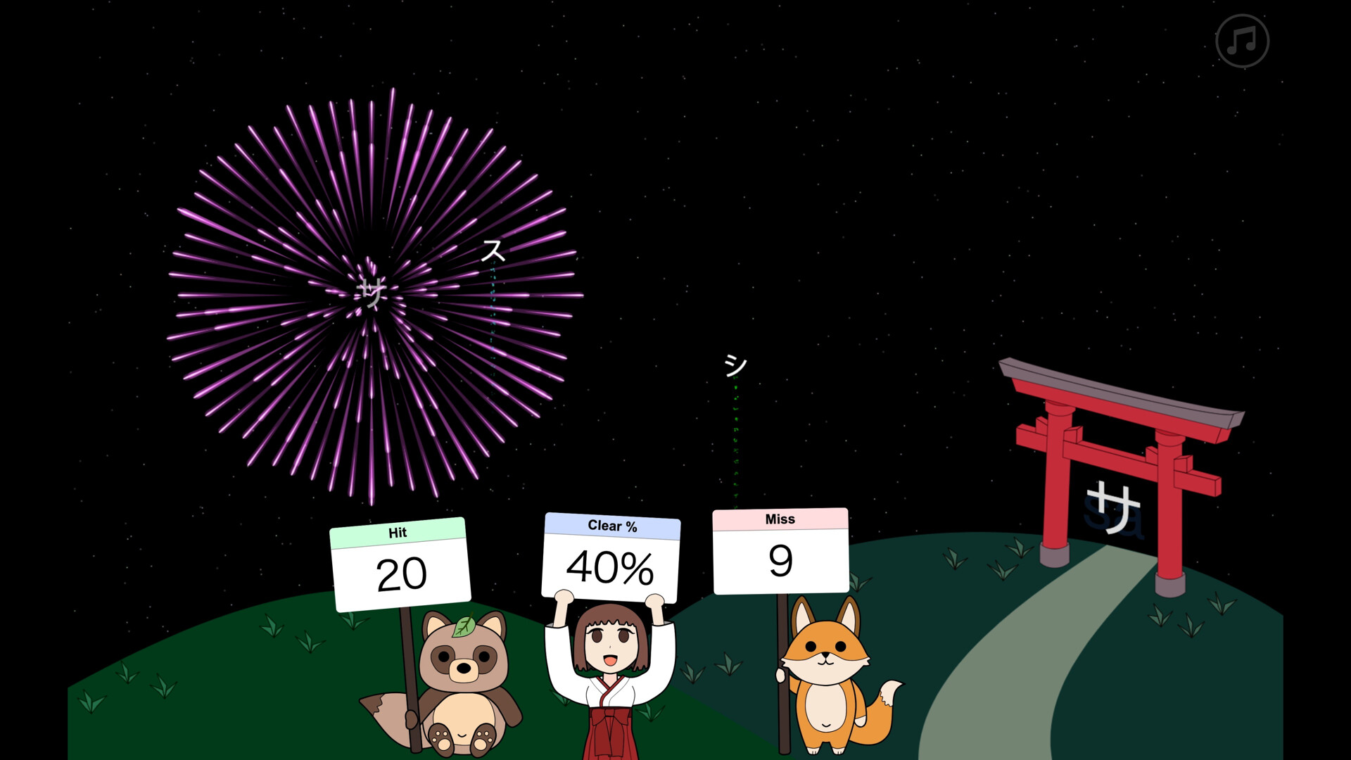 Fireworks of kana characters launch into the air. By typing the correct letters on your keyboard, you'll light up the sky!