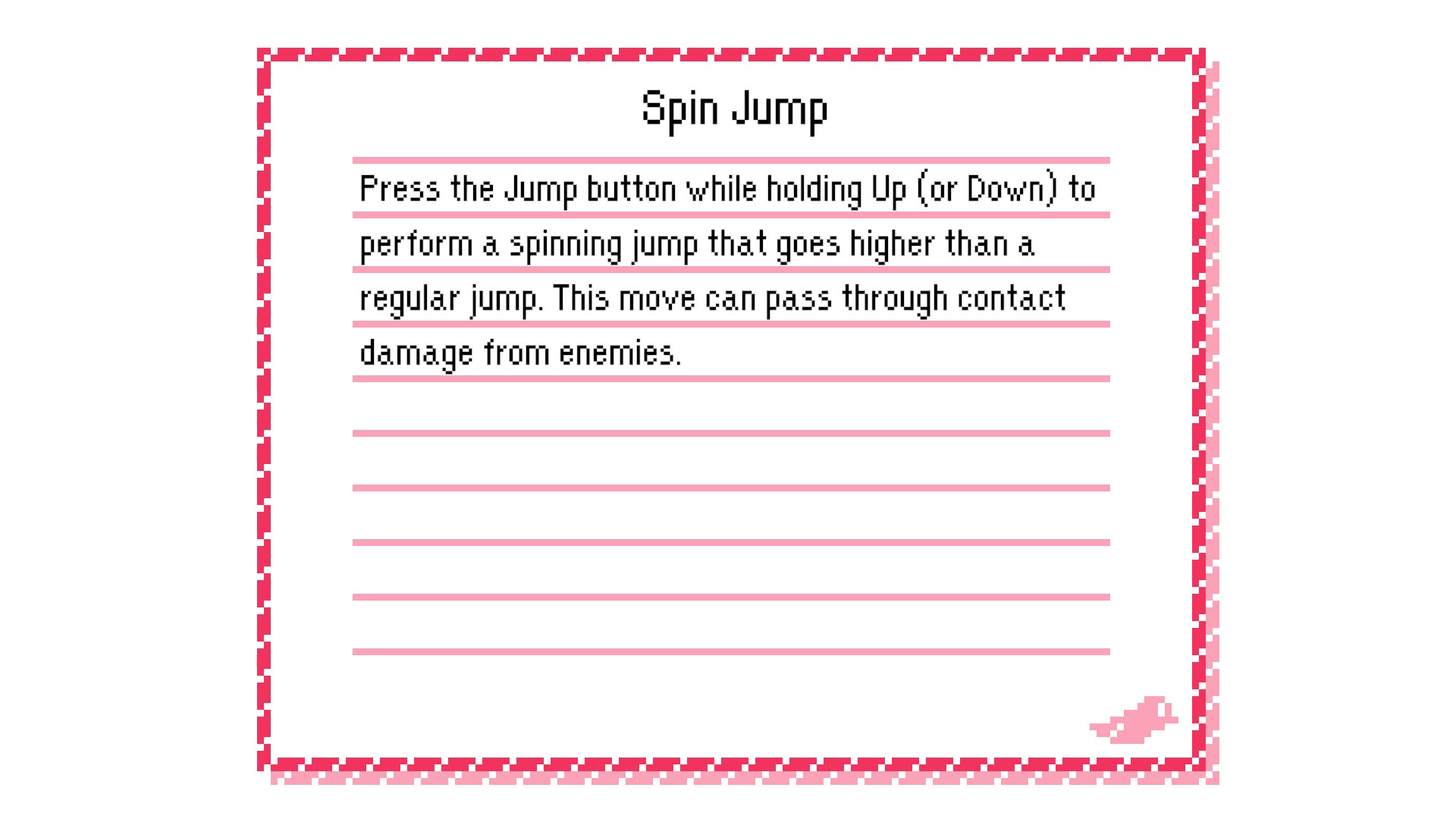 Spin Jump (Up + Jump / Down + Jump): Jumps higher than usual and deals light damage to enemies. Ignores contact damage from enemies.